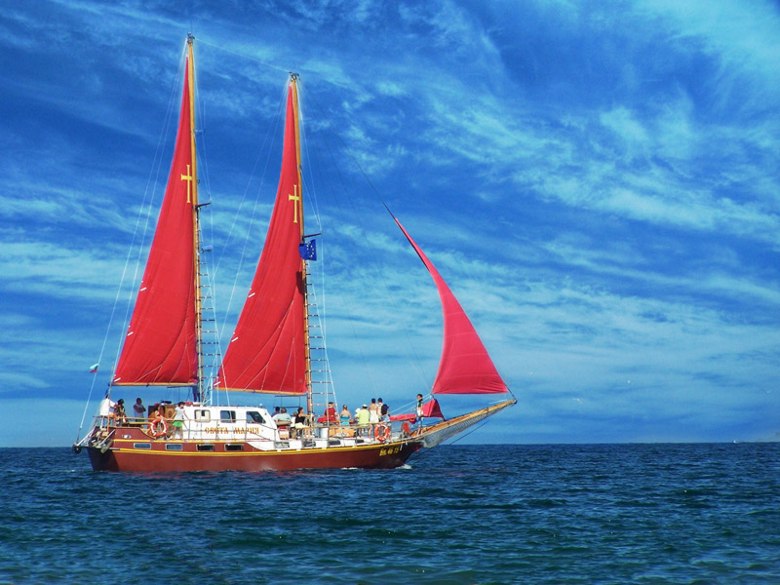 А яхтата с червените платна на пристанището се казва „Света Мария”. Управлява я най-сладкодумния капитан на всички времена и морето. И има ковчеже с карта на съкровището и златни монети.
