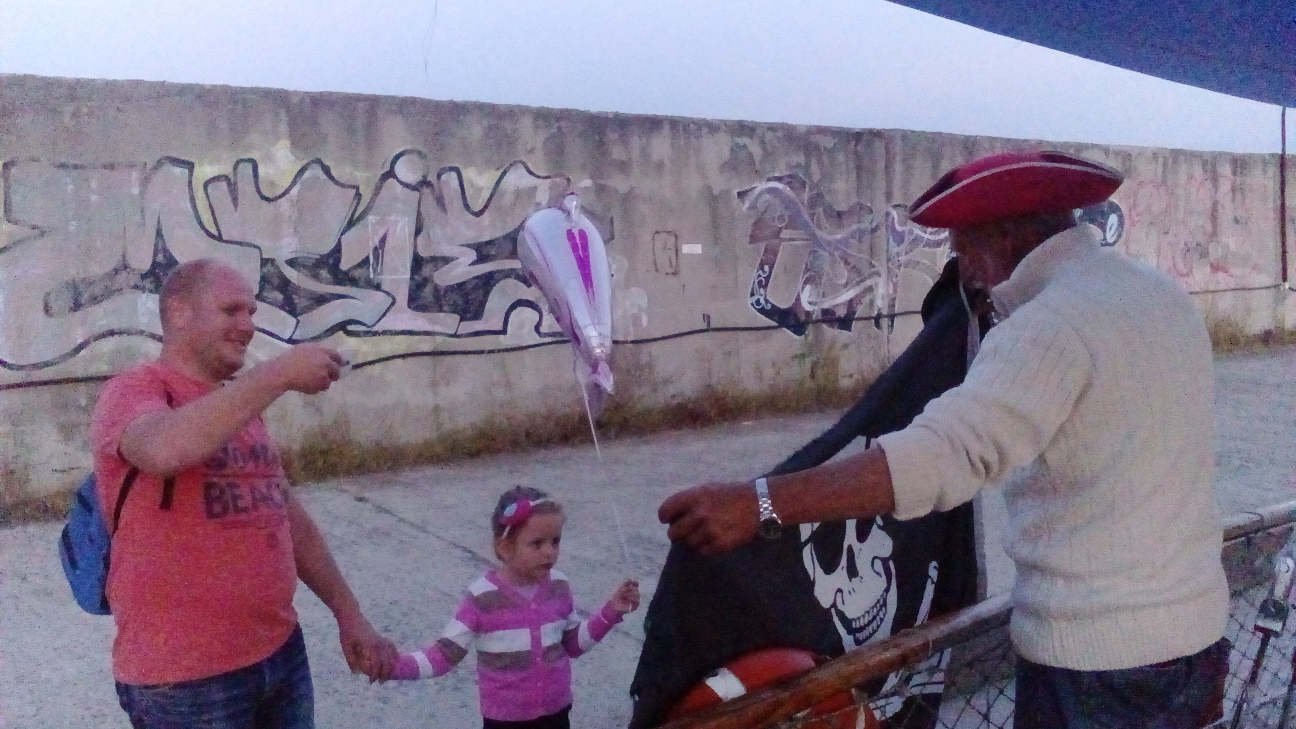 „Здравей!”-махам и аз. Тя се приближава по-близо до кораба и пита:”Вие какви пирати сте?”. Капитанът е излязъл вече от каютата и и отговаря:”Аз съм Червения пират”. Слага червената триъгълна шапка и я кани на борда да се снима.