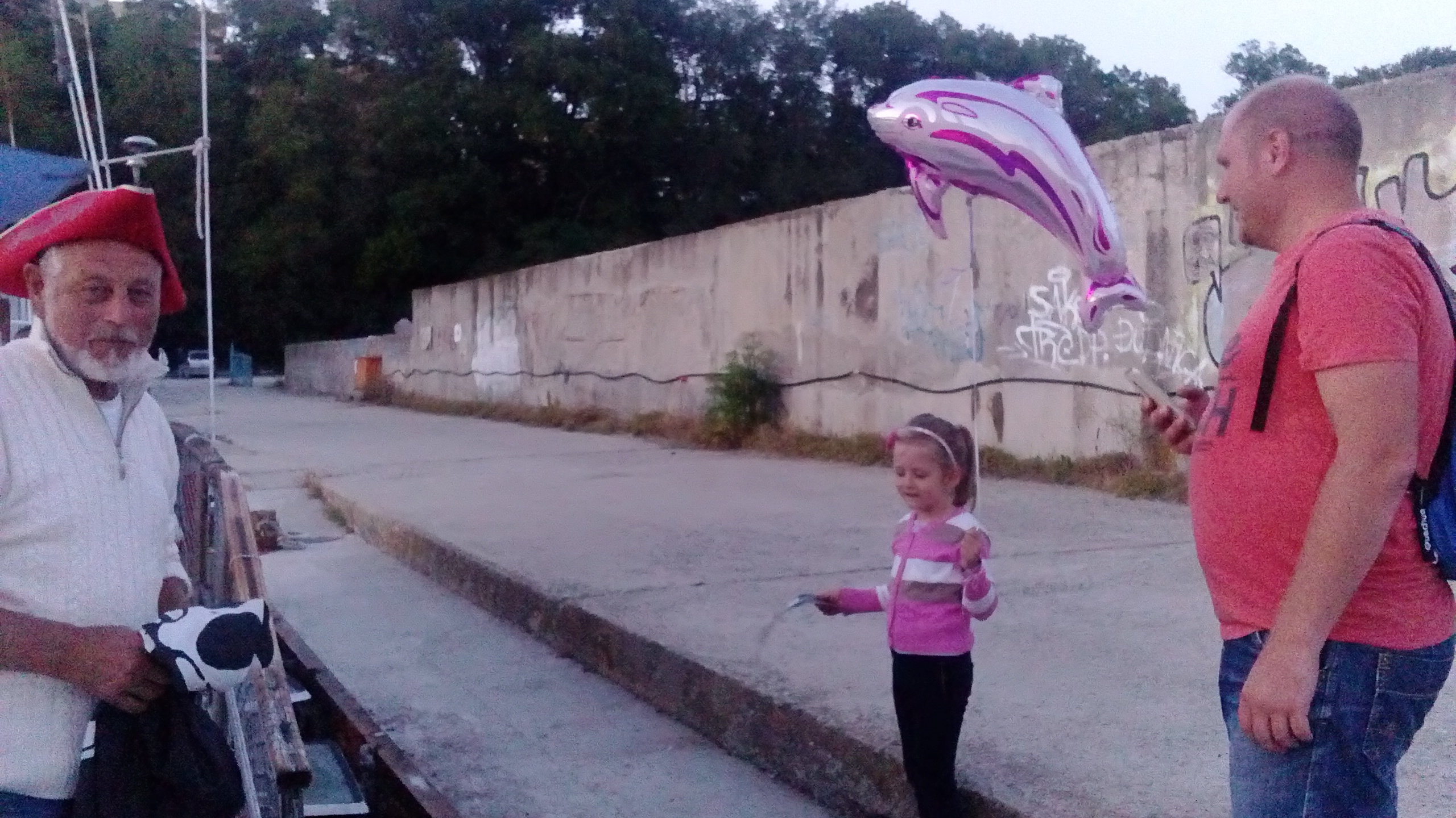„Само да питам мама, дали разрешава”-уверено казва розовото момиченце. Изчезва и се появява пък, поела уверено към кораба. Зад нея върви млад мъж, русоляв, с нейните, почти, черти. Обяснява ни: „Тя гледаше яхтата няколко дни от брега и говореше за нея. С тези кръстове на платната и приличала на пиратска”