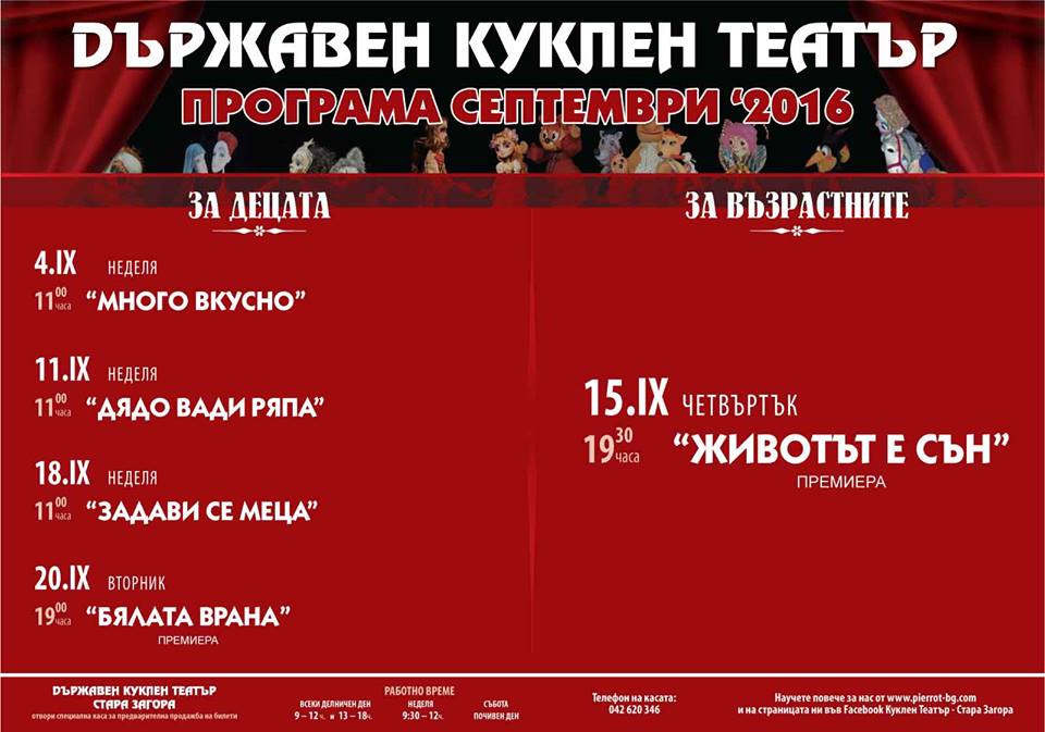 На 15 септември е първата премиера, пиесата за възрастни „Животът е сън” от Педро Калдерон де ла Барка. Адаптирана от режисьора Ирослав Петков, пиесата е мегапродукция на театъра, с оригинална сценография на Петър Митев, фехтовка и …още изненади. В състава на постановката са и външни актьори – Георги Спасов и Валентин Владимиров /познат като режисьор на „Пипи дългото чорапче”, „Храбрият оловен войник”/. В подготовката и сложната сценична адаптация на техническите решения като лайтдизайнер /художник по осветлението/ участва и Ивайло Марков – директор на Кукления театър в Търговище. „Заглавието на пиесата е красноречиво. В нея става дума за това, доколко живеем, кога сънуваме. Когато човек се събуди от един сън, който е бил толкова реален се чуди – къде се намира всъщност? В пиесата става дума за Честта, за Лъжата, за Предсказанията /доколко са верни/ и най-вече за това – колко има съдба и колко може човек сам да управлява съдбата си” – казва режисьорът Ирослав Петков.