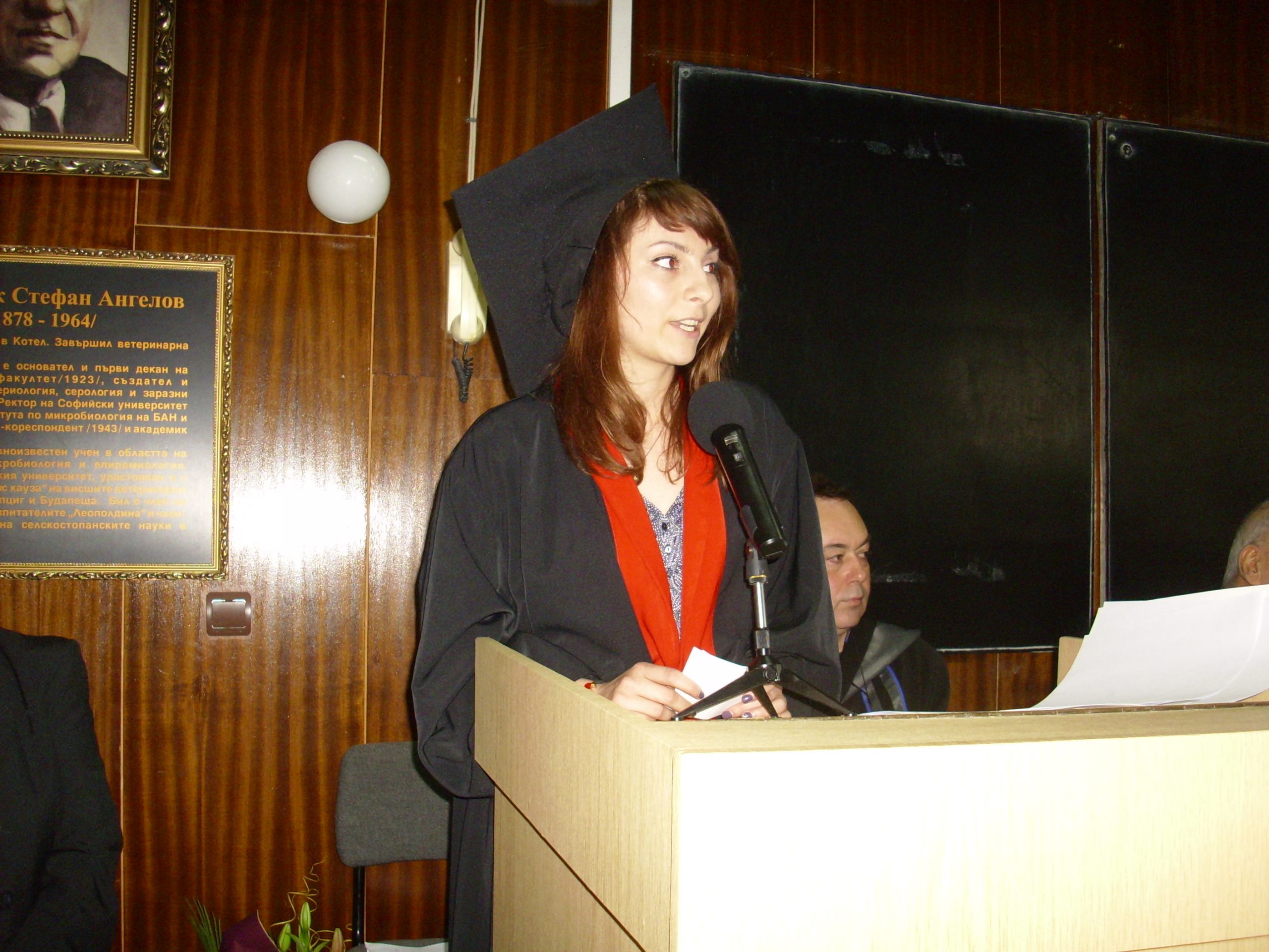 Първата диплома беше връчена на д-р Анна Мирчева – първенец на випуск’89. Госпожицата получи още наградата на ректора на университета и на факултета, наградата на Община Стара Загора, която връчи председателят на Общинския съвет Таньо Брайков, а д-р Дамян Миков покани отличничката на работа в Агенцията по храните. Отличници са и Силвия Петрова, Камелия Владимирова, Кремена Христова и др.