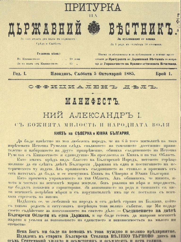 Наближава 6 септември – официален празник на Р. България по повод Обединението на Княжество България с автономната османска провинция Източна Румелия през 1885 г. Завършваща и основна роля за това обединение изиграва Манифестът, издаден от монарха на тогавашното Княжество България – княз Александър I Батенберг. По негово желание, князът е погребан в специален мавзолей, издигнат от признателните българи в столицата на обединена България – София.