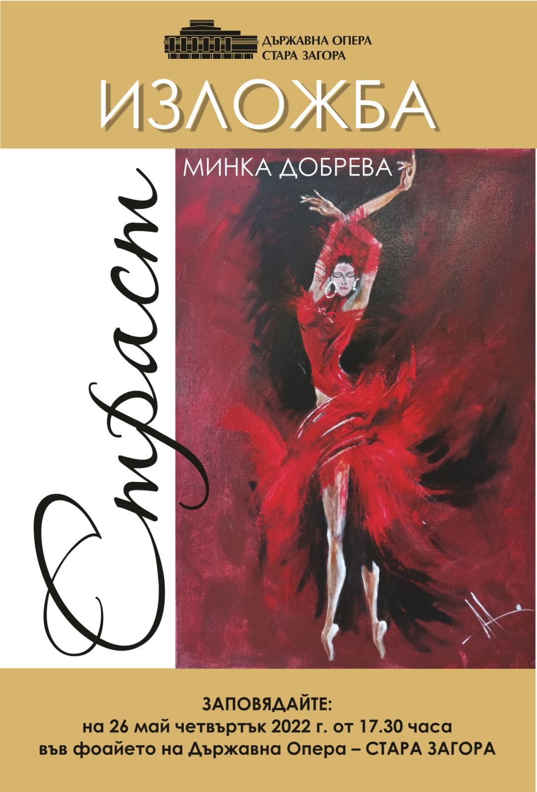 Преди началото му, от 17.30 часа, във фоайето на Държавна опера Ст.Загора ще се открие изложбата на Минка Добрева „СТРАСТ“!