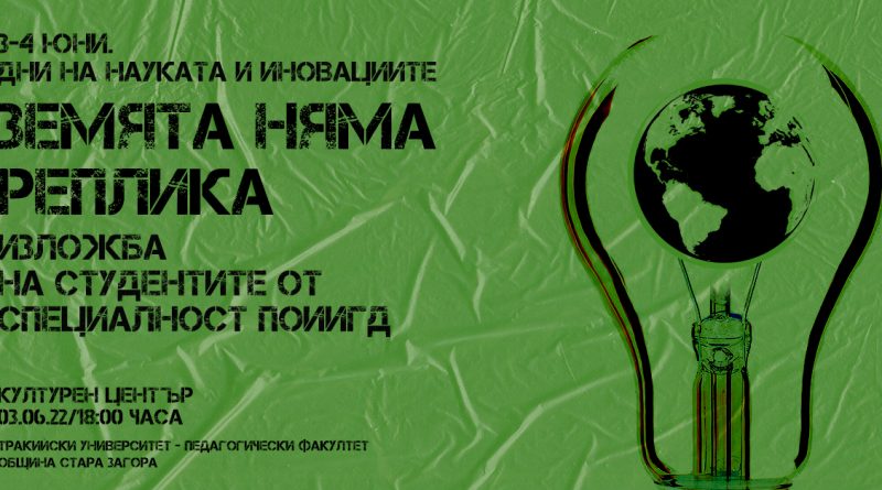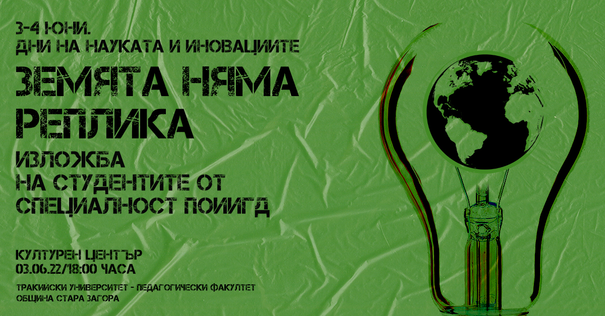 На 03.06.2022 г. от 18 ч. в Културен център „Стара Загора“ ще се открие изложба “Земята няма реплика 2.0”. Тя съпътства научно-популярна конференция под наслов „Дни на науката и иновациите: Чиста енергия. Състояние и перспективи“.