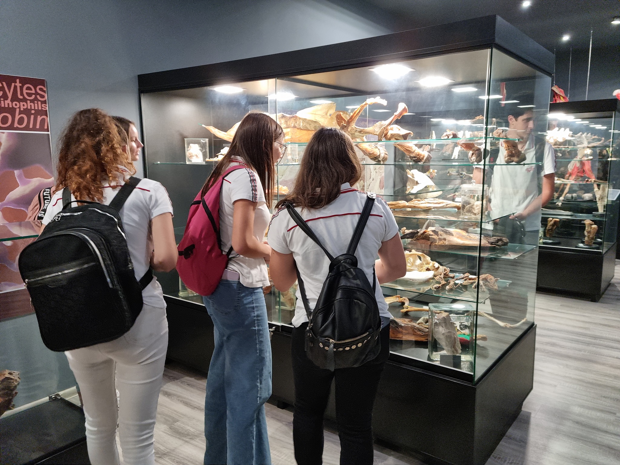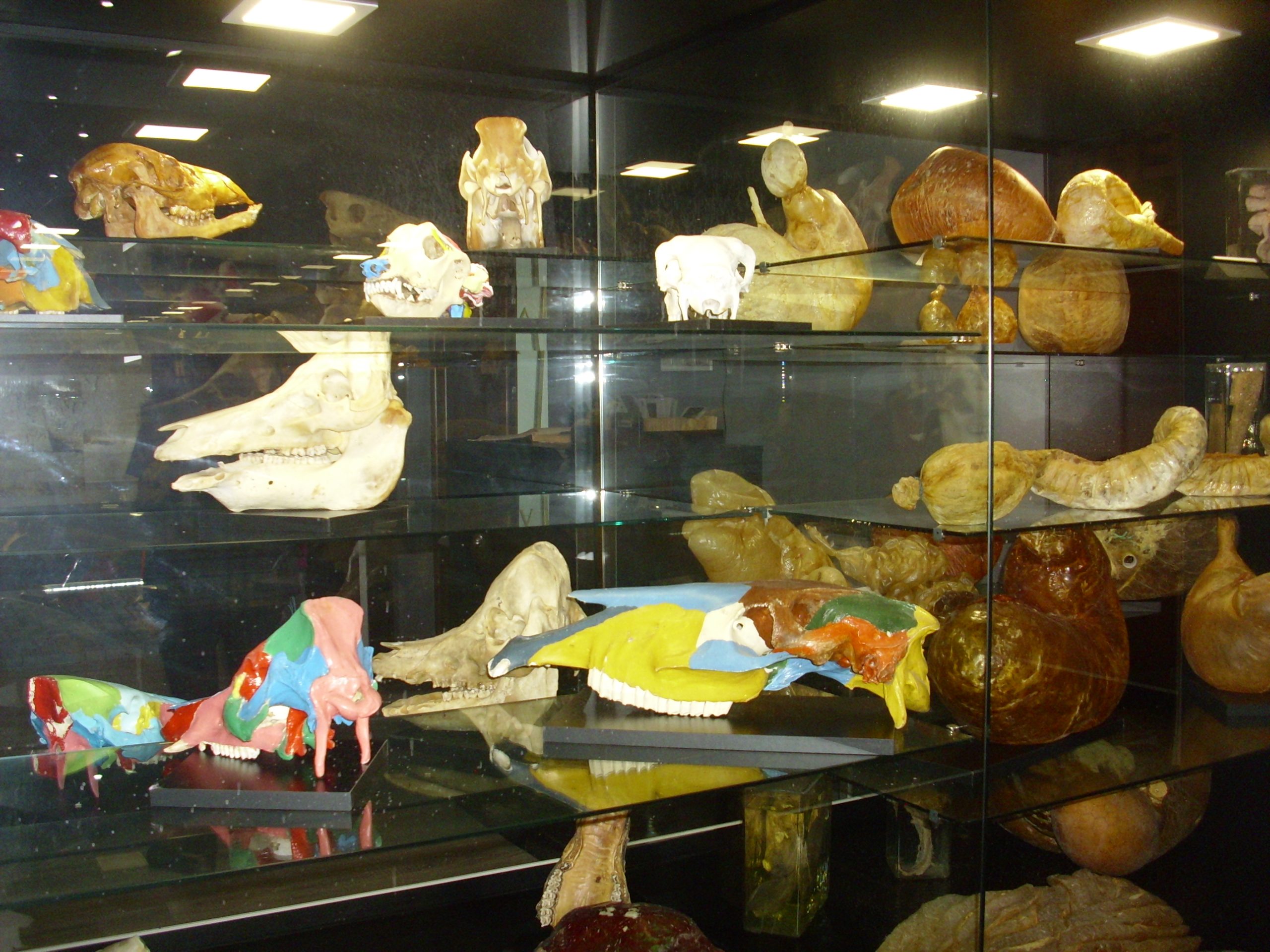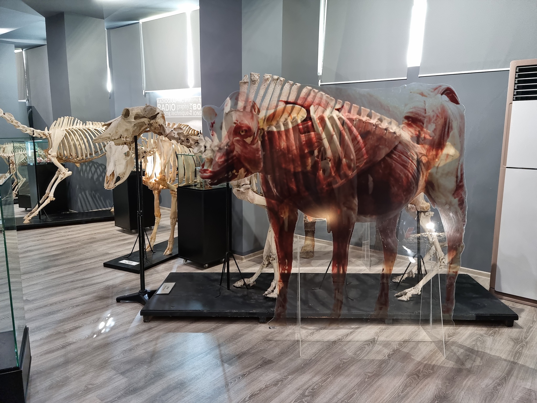 В отделни грамадни витрини са подредени различни елементи от скелетната система – бял дроб, различни стави, кости – има и скелет на змия; устройство на мускулната тъкан, вътрешни органи; части от крайници на говедо, кръвоснабдяване и инревация на крайниците; показани са вените на главата, устройство на колянна става с минискусите. В друга витрина са представени тазови органи от различни видове животни – матка на кон, пикочен михур на свиня, матка от дребно преживно животно, ембрион от говедо, бременна матка от дребно преживно животно, специфични анатомични образования.