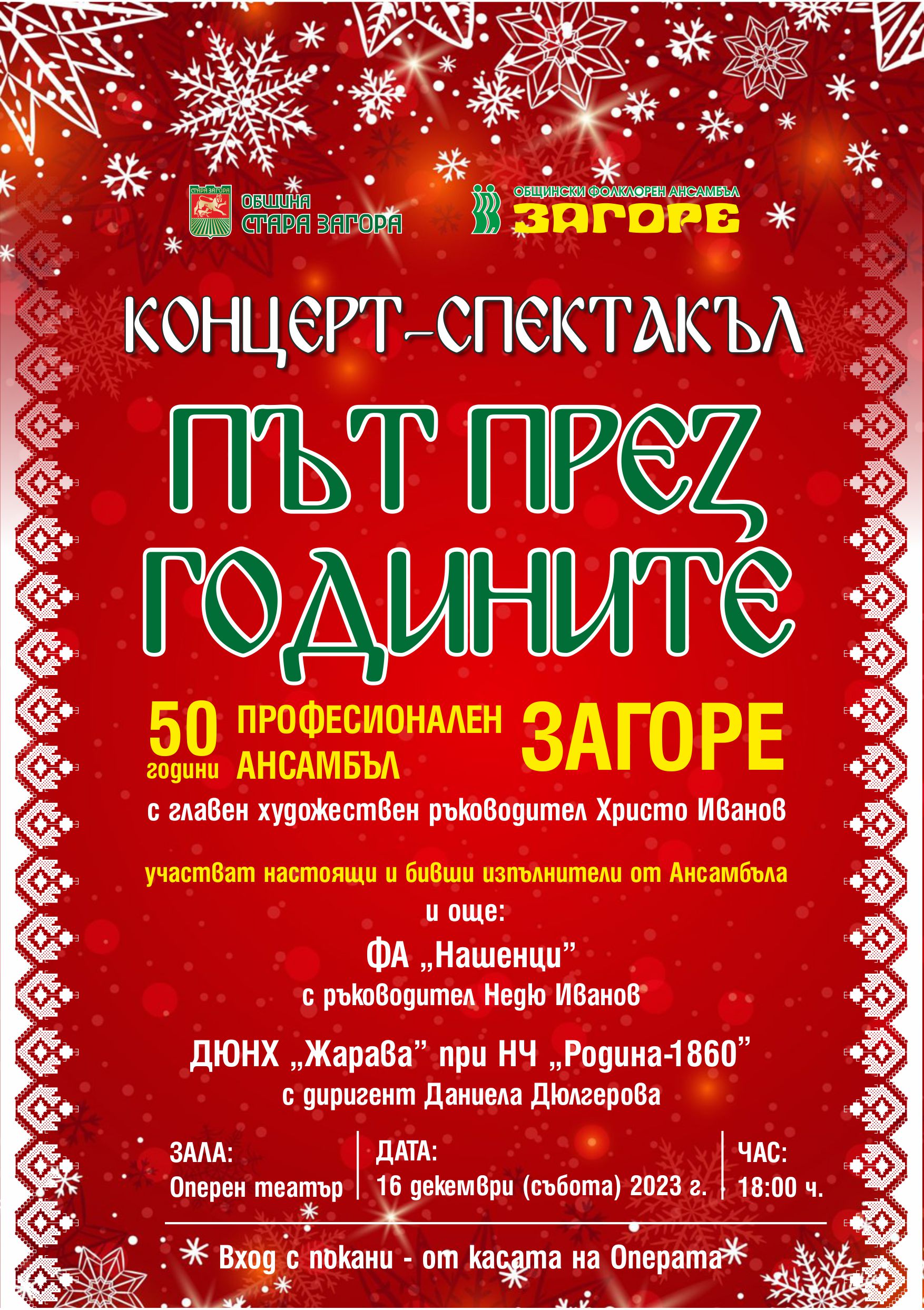 Професионален ансамбъл „Загоре“, с главен художествен ръководител Христо Иванов, ще отбележи своя 50-годишен юбилей със запомнящ се концерт-спектакъл под надслов „Път през годините“. Събитието ще се състои на 16 декември  (събота, от 18.00 часа в Оперния театър. На сцената ще се качат настоящи и бивши изпълнители на „Загоре“, както и Фолклорен ансамбъл „Нашенци“ с ръководител Недю Иванов и Детско-юношески народен хор „Жарава“ при НЧ „Родина-1860“ с диригент Даниела Дюлгерова.