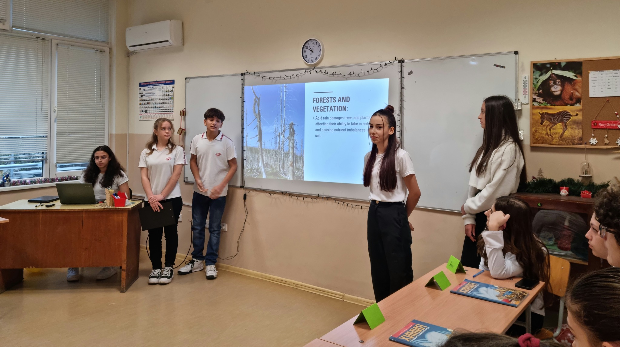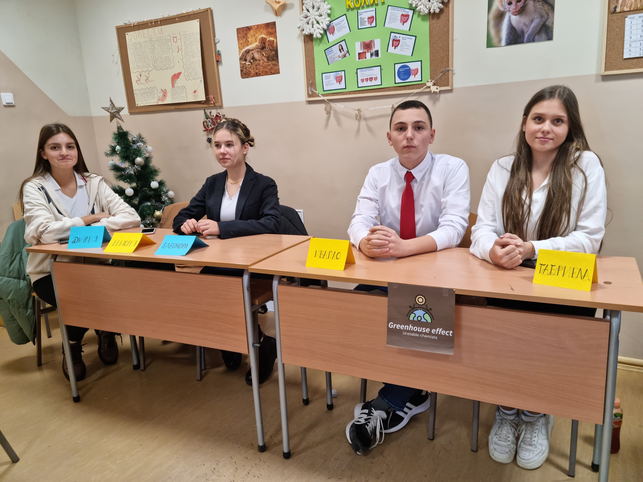 . Отбор Unstable Chemists (Виктория, Вилислав, Габриела, Джулия, Елеонора, Ивайло, Яна и Яница) говори за парниковия ефект. Отбор Environmentalists (Александра, Анна, Виктор, Дария, Ивелина, Кремена и Симона Гочева) за обезлесяването