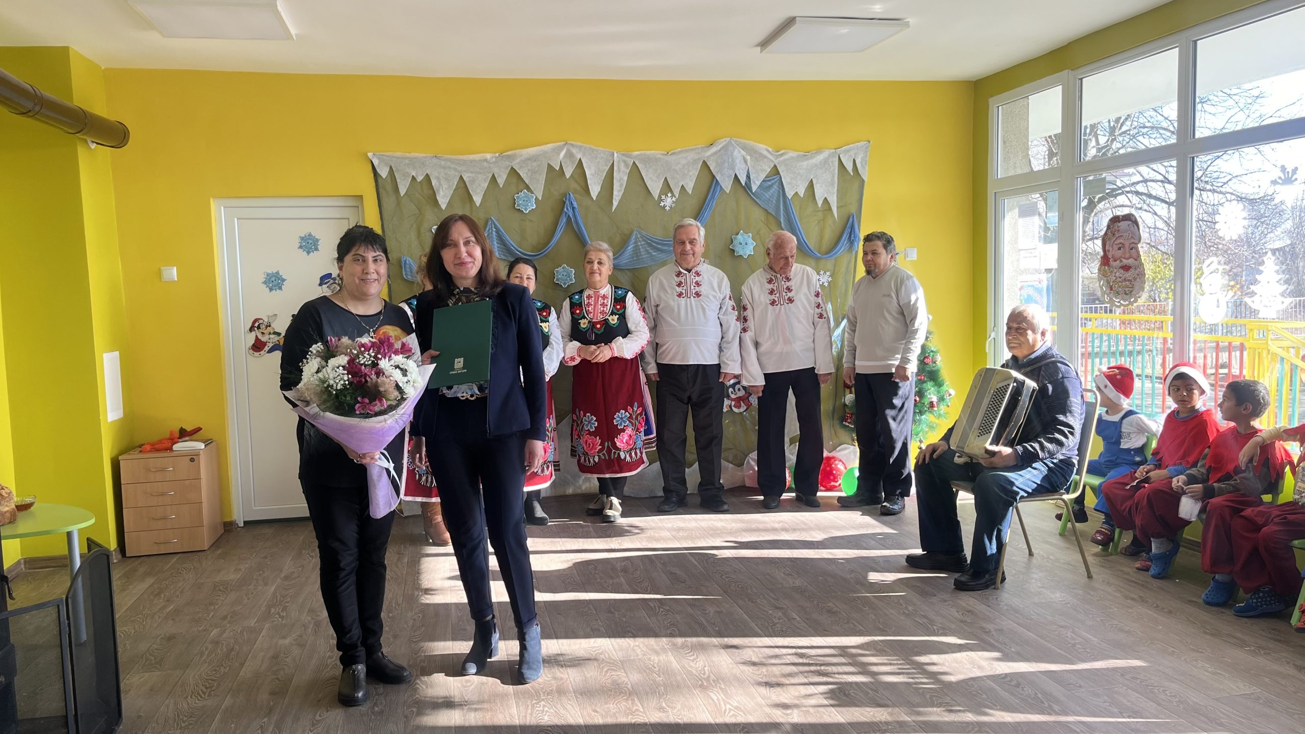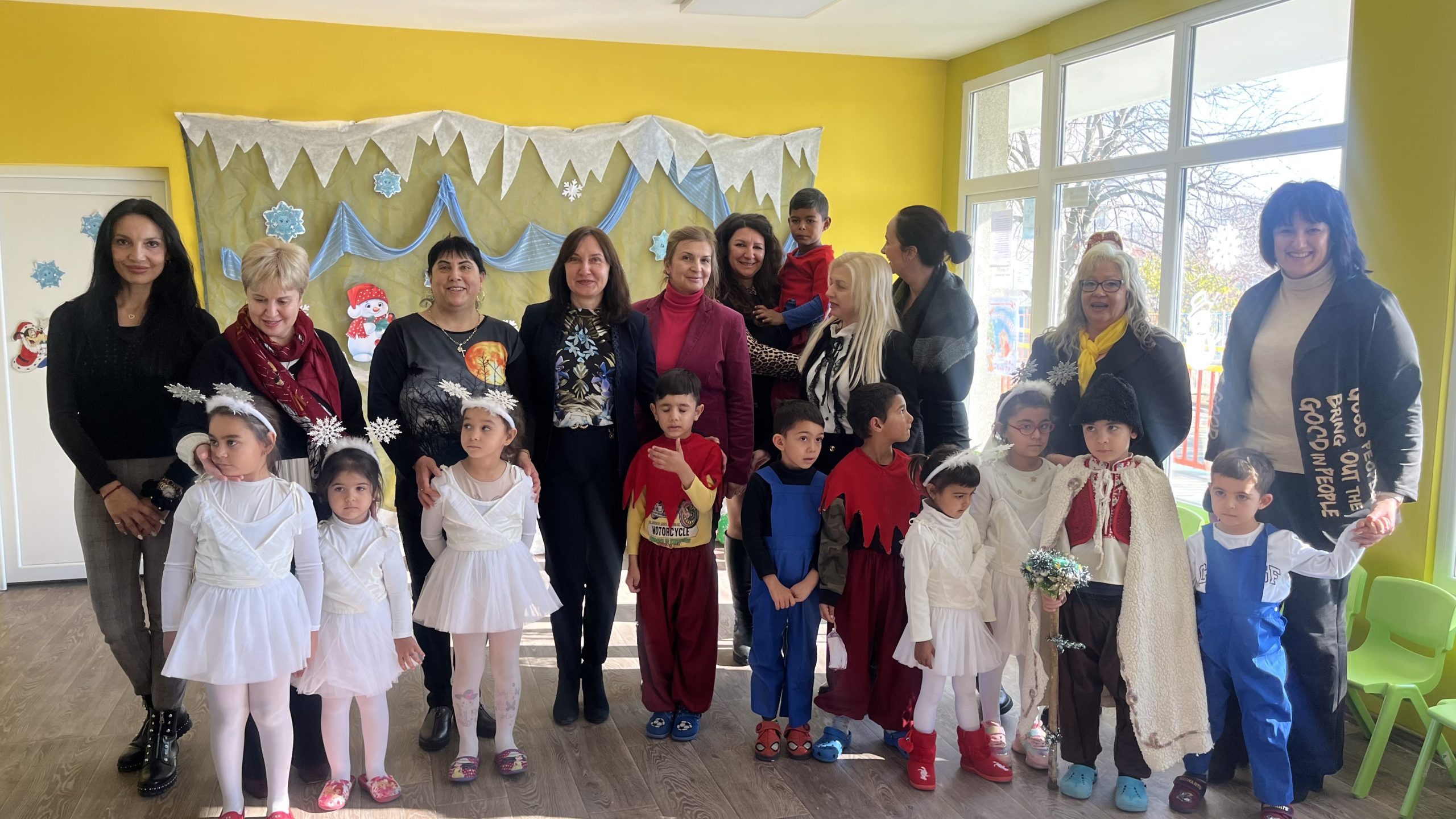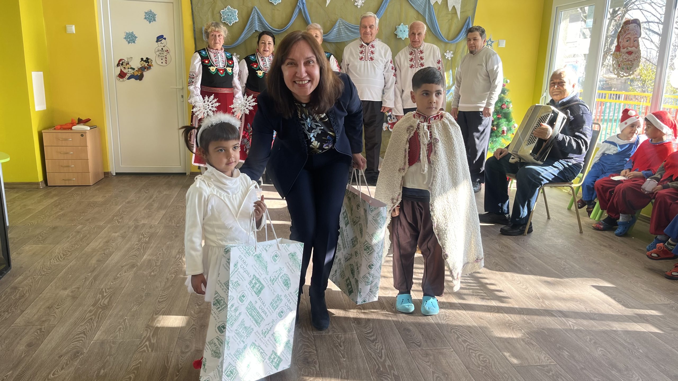 „Радвам се, че съм тук с вас на този така специален празник! Пожелавам ви много здраве, споделеност и успехи. Нека бъдат светли предстоящите празници и през новата година да бъдете все по-сплотени и задружни“, поздрави малчуганите зам.-кметът на община Стара Загора Надежда Чакърова. Тя подари на двете групи образователни игри с пожелание за още повече знания, но и разбира се – достатъчно време за забавления.