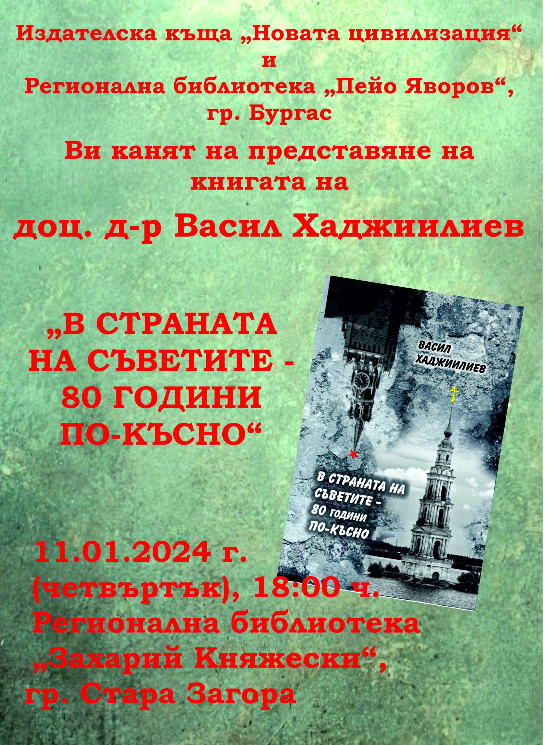 Навръх рождения си ден (2х35) г-н Хаджиев кани старозагорци на чаша вино. Ще представи и новата си книга „В страната на Съветите – 80 години по-късно“, вдъхновена и посветена на един велик българин – проф. д-р Асен Златаров.