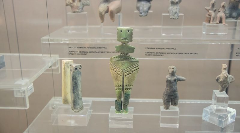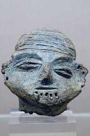 Глава на керамична антропоморфна фигурка, Късен халколит (края на V хил. пр. Хр.), открита в селищна могила край с. Диня, Старозагорско Уникално произведение на антропоморфната пластика от периода на късния халколит. Главата изобразява лице на мъж с притворени очи, с моделирани нос, уста и украса под нея. Горната част на главата е украсена с врязани линии, запълнени с бяла и червена материя. Вероятно това е фигурка на върховния бог-небе. Според вярванията на древните, от неговия свещен брак с богинята-майка се ражда плодородието на нивата, в кошарата и в дома.