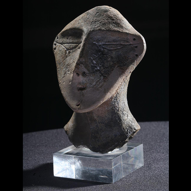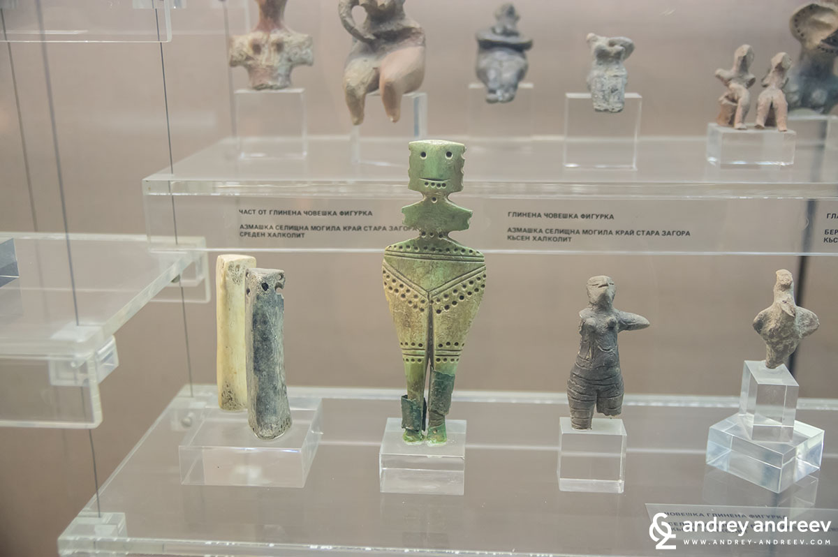 Глава на керамична антропоморфна фигурка, Ранен халколит (нач. на V хил. пр. Хр.), открита в селищна могила при яз. Чаталка, Старозагорско. Лицето е оформено с ромбовидна форма, очите са притворени. Подчертани са носа, ноздрите и устата. По ушите има пробити малки отвори, в които вероятно са били поставени медни обеци. Горната част на главата е оформена с овална издатина, което показва, че антропоморфната фигурка, част от която е била главата, е заемала висока позиция в йерархията на древните божества.