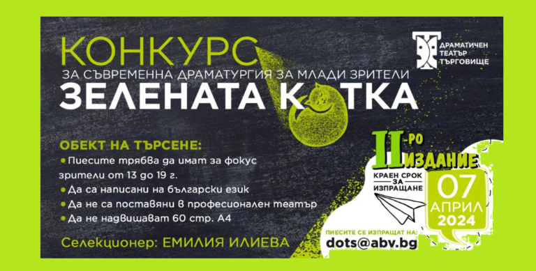 За втора поредна година Държавният драматичен театър в Търговище организира национален конкурс за съвременна драматургия за млади зрители „Зелената котка“, чиято цел е откриването и отглеждането на нови и оригинални пиеси на български автори, интересуващи се от проблемите и мечтите на тийн поколението в страната.