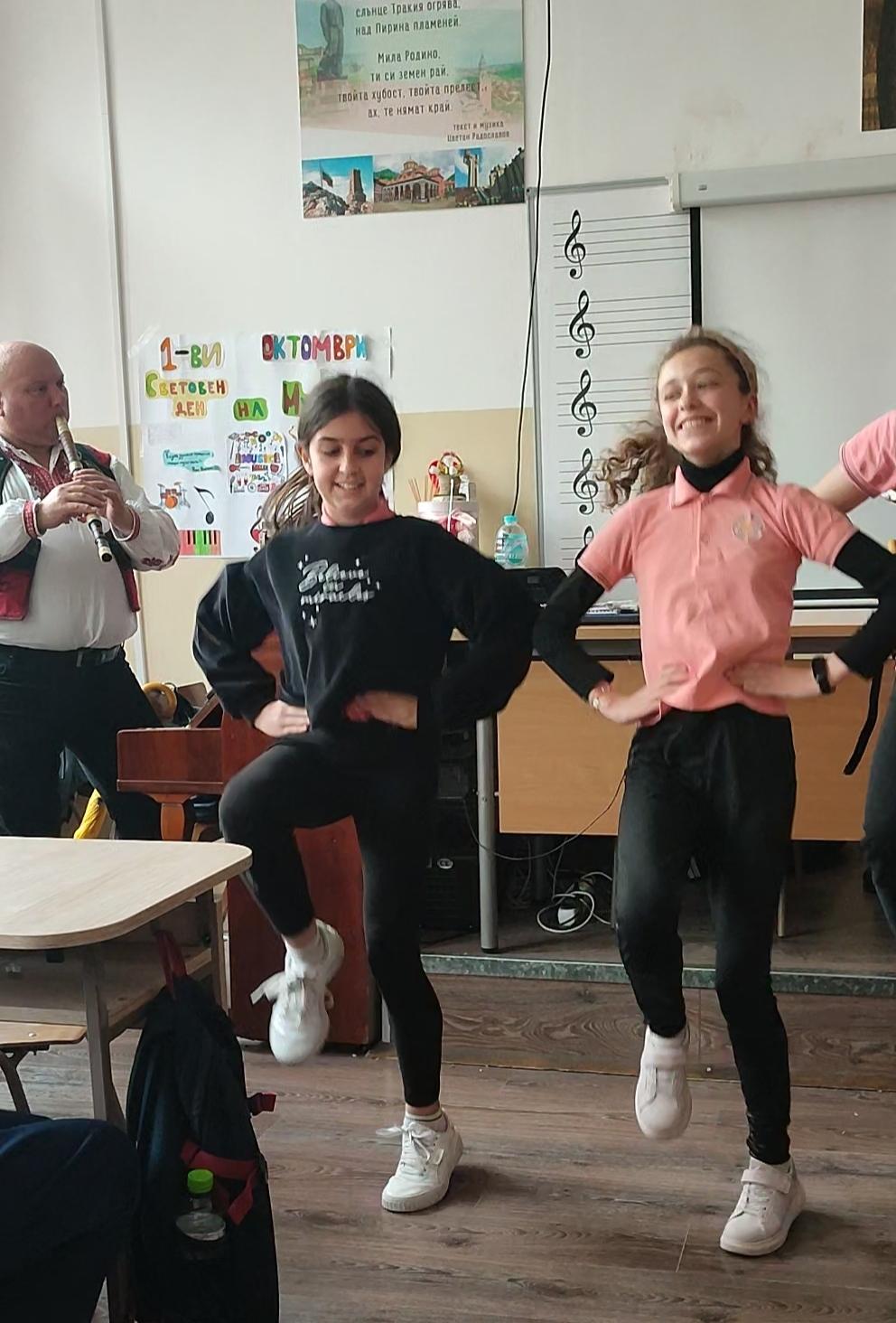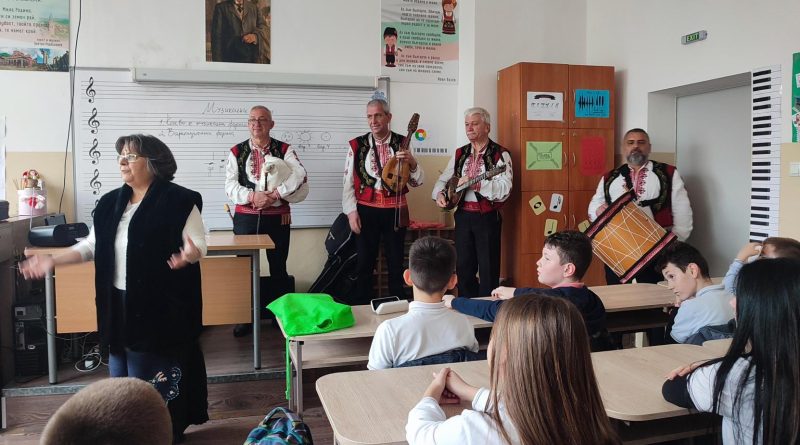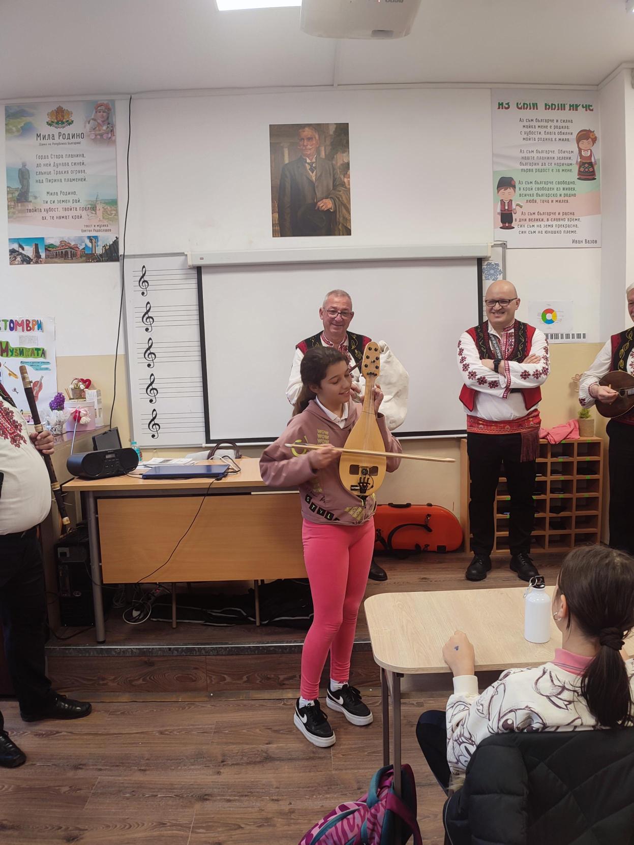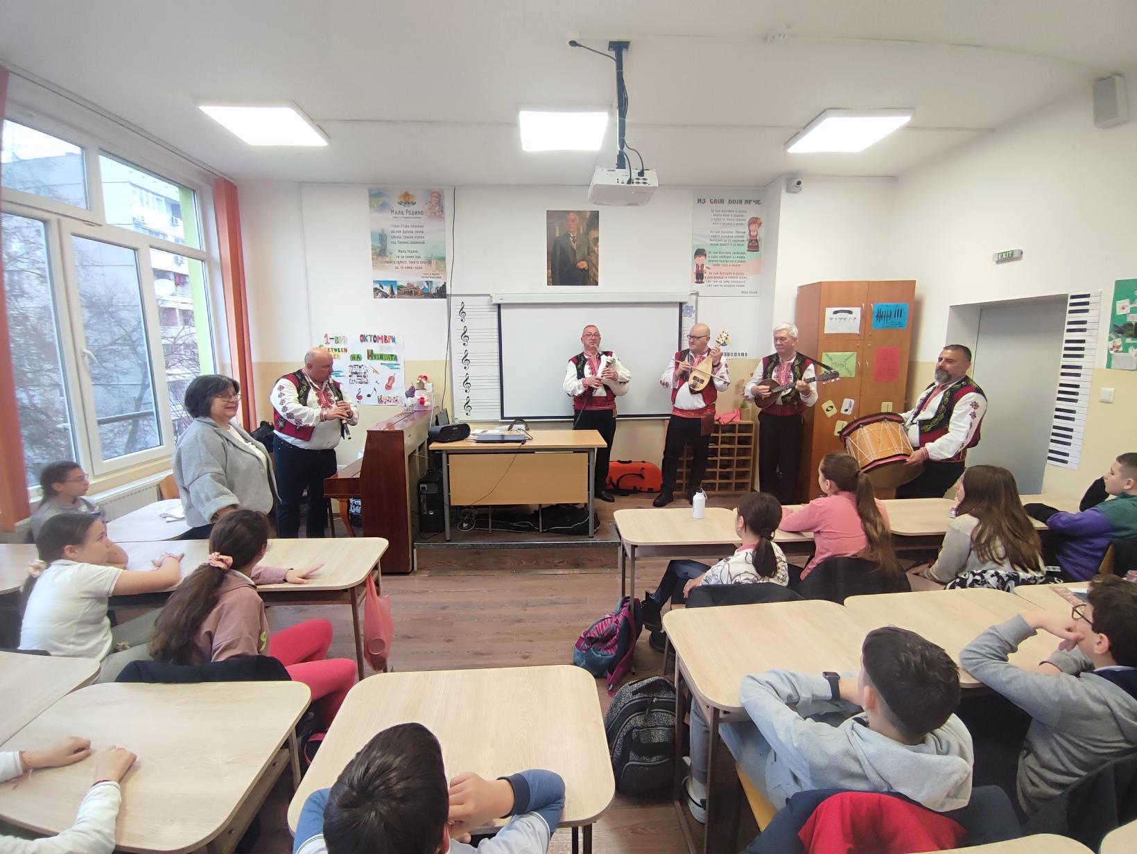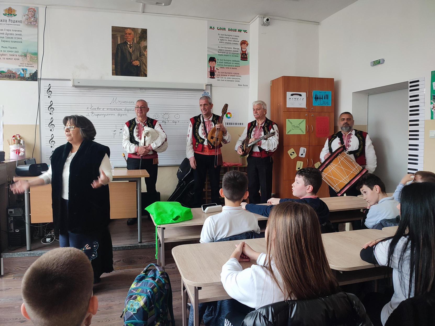 В този необичаен и различен за учениците час никой не скуча. Някои тях опитаха да свирят на инструмент, други тропнаха ръченица, но накрая всички заедно, съвсем непринудено запяха любими народни песни под съпровода на музикантите от битовия оркестър – Марко Марков /кавал/, Георги Кръстев /гайда/, доктор Пейо Пеев/ гъдулка/, Цветан Минчев /тамбура/ и Евгени Марков /тъпан/.