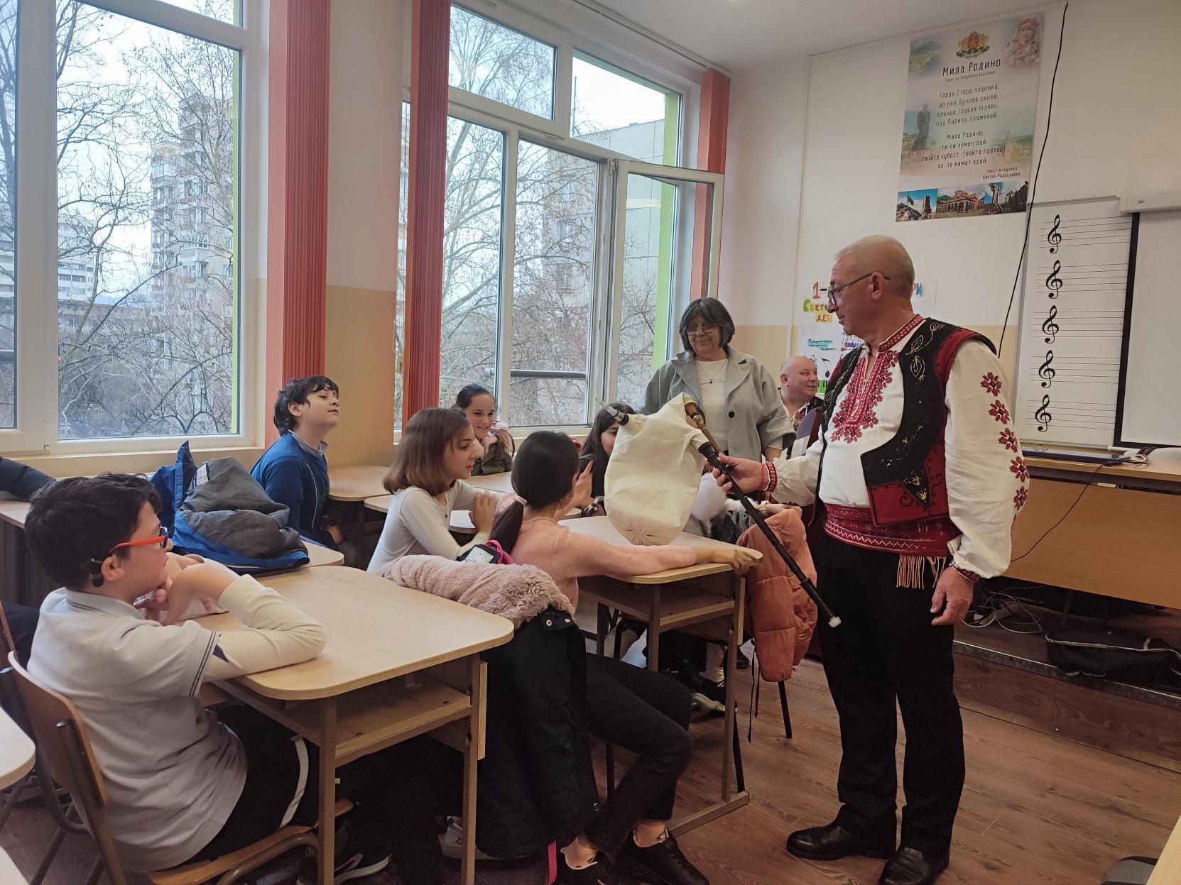 В час по музика те имаха възможност да „черпят от извора“. Запознаха се с устройството на всеки един от народните инструменти, разбраха от какви материали се изработват, чуха характерните им тембри „ на живо“.