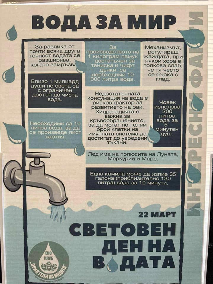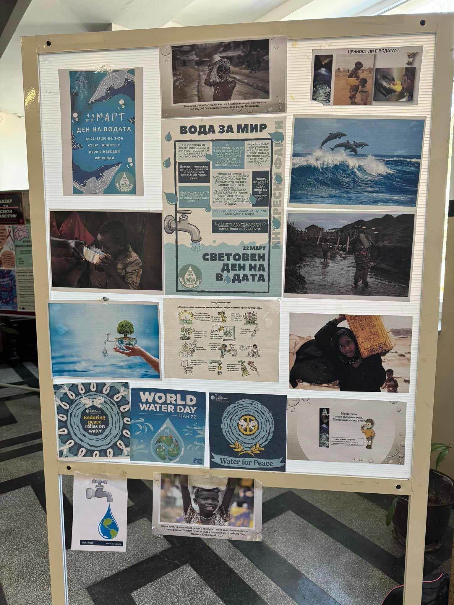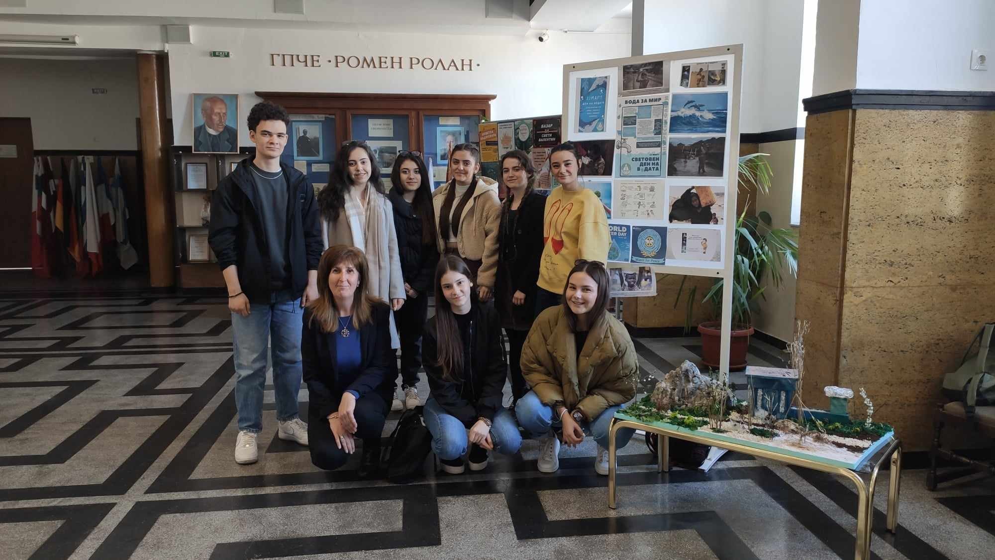 С викторина от любопитни факти и специално оформен кът от макети и информационни материали възпитаниците на екоклуб „Приятели на водата“ към ГПЧЕ „Ромен Ролан“ отбелязаха Световния ден на водата – 22 март, който тази година протича под слогана „Вода за мир“. Екозащитниците от десетите класове вложиха много време и усърдие в подготовката на своеобразния празник. Сред тях са Габриела Панкова от 10 „в“ и Радина Ганева и Кристиана Маджарова от 10 „ж“ . Те бяха подготвили макети, онагледяващи кръговрата на водата. Стефан Георгиев от 10 „ж“ умело се включи с изработването на информационно табло, свързано с любопитните факти по темата! Делфин, изработен от пластмасови капачки, призоваваше за рециклирането на отпадъците, замърсяващи ежедневно световните води! Пламена Колева от 10 „в“ собственоръчно сътвори красиви тематични стикери, които станаха подарък за отговорилите вярно на въпросите от викторината. Най-активните участници получиха стъклени шишета за вода и други предметни награди. Много настроение и пролетна емоция изпълниха училищното фоайе на втория етаж! Всички участници научиха много нови и любопитни факти за водата.