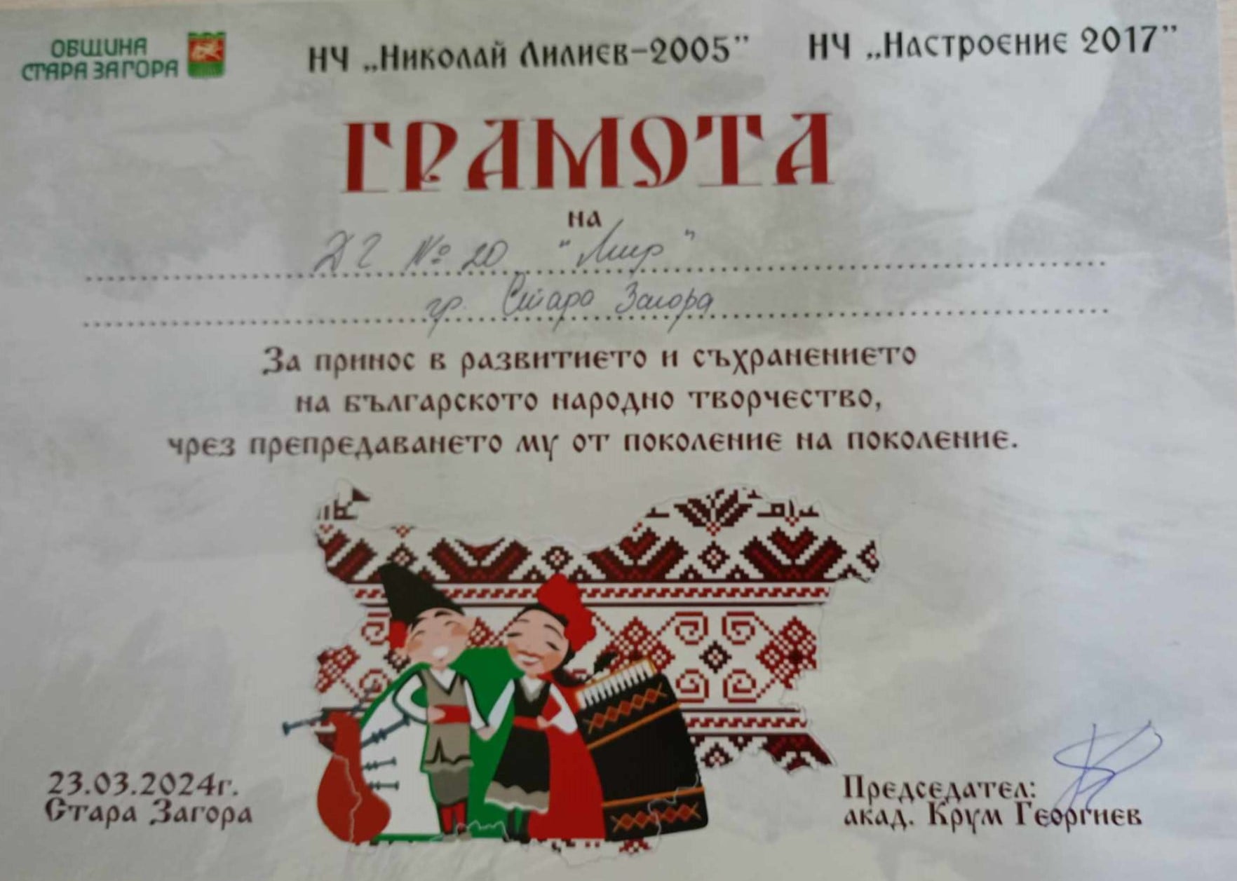 Децата от група „Мечо Пух“ и група „Пчеличка“ при ДГ №20 „Мир“ в Стара Загора направиха нещо изключително този уикенд, като се включиха в един от най-забележителните и оживени фестивали в региона – фестивала на маскарадните игри. Този празник на българската традиция привлече вниманието на много хора от града и региона. С усмивки и вълнение, малките кукери не само представиха своите умения и таланти пред публиката, но и показваха гордо българската култура и традиции. Облечени в традиционни народни носии, те представиха своите ръчно изработени маскарадни кукерски маски. С участието си в този фестивал, децата от ДГ 20 „Мир“ не само създадоха незабравими спомени за себе си, но и спечелиха възхищението на всички присъстващи. Тяхната енергия, радост и ангажираност показват, че дори в млада възраст те са готови да се включат и да запазят българските традиции живи и забележими. С участието си във фестивала на кукерските игри в Стара Загора, децата от ДГ 20 „Мир“ доказват, че и малките сърца могат да носят голяма част от духа на нашата национална идентичност и да бъдат част от нейното богатство и разнообразие.