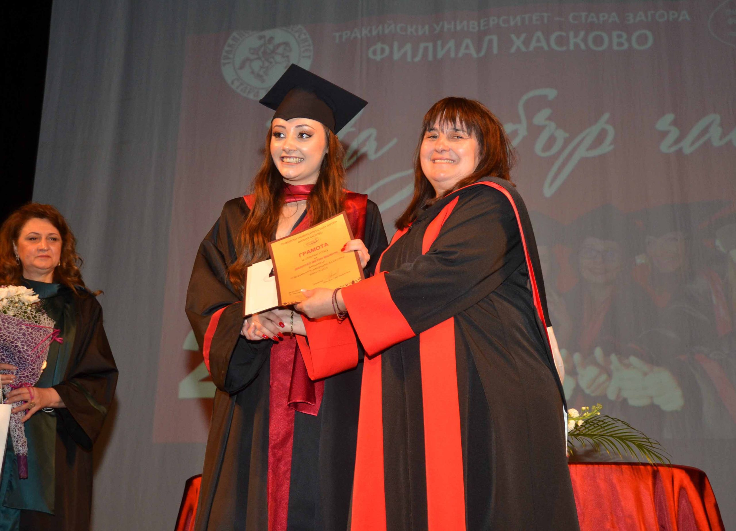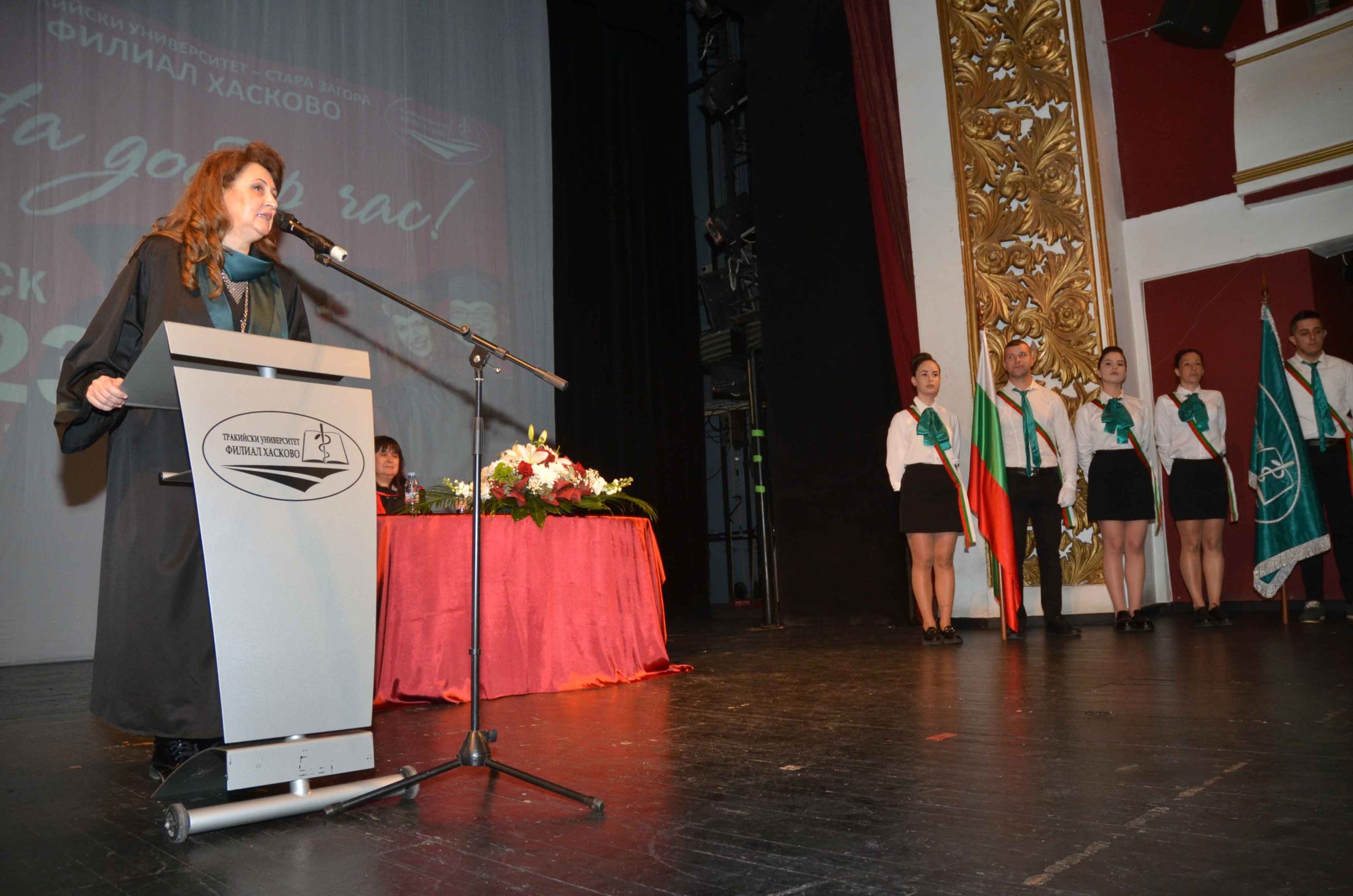Директорът на Филиал Хасково, доц. Таня Паскалева изпрати своите възпитаници с думите: “Випуск 2023 ще бъде запомнен със своето ярко присъствие в академичния живот на нашето учебно заведение. Запазете този силен дух, своето дръзновение и целеустременост, но не забравяйте, че съвършенството в професията се постига с време и усилия. Попътен вятър и успех!“