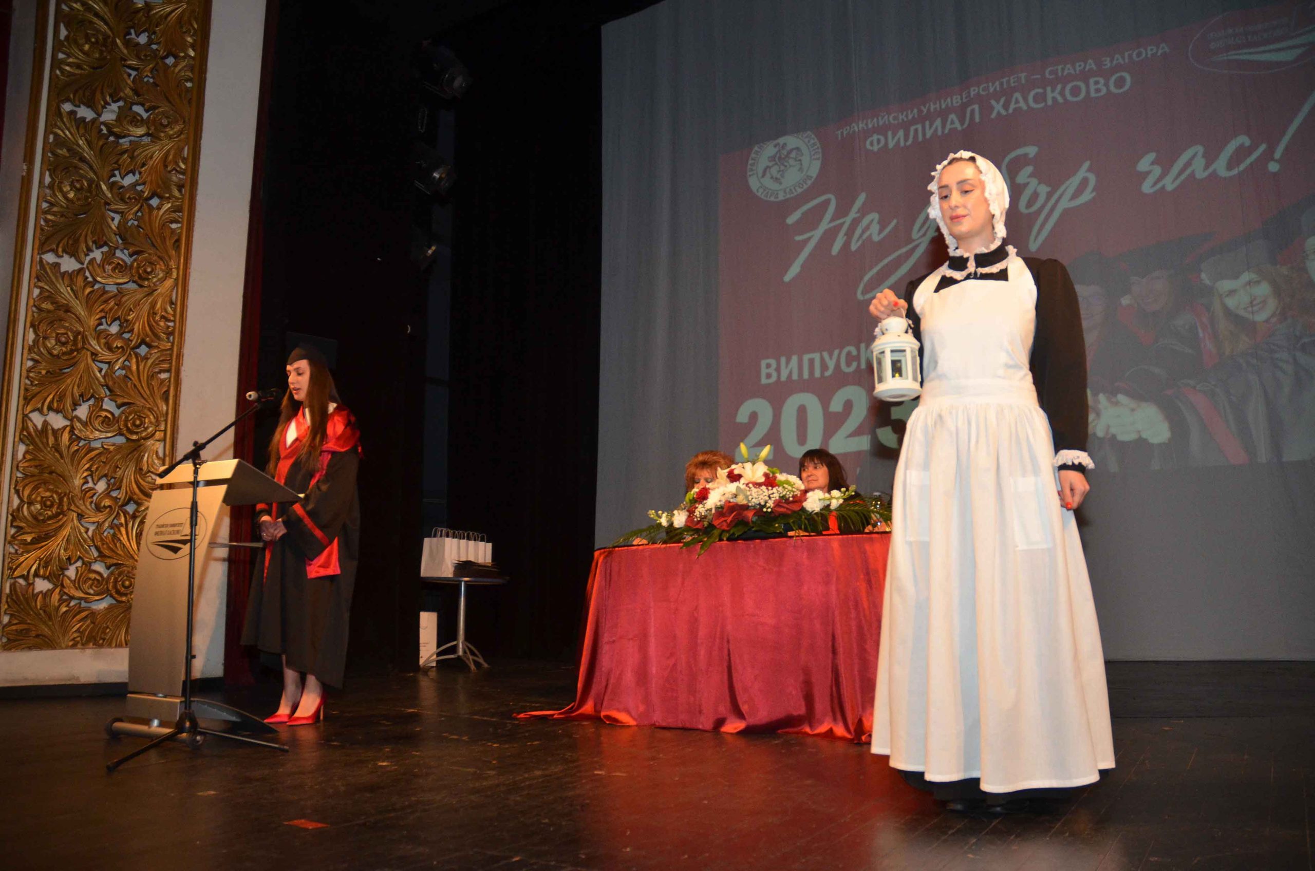 На официална церемония днес Филиал Хасково на Тракийски университет изпрати абсолвентите от випуск 2023. Общо 45 дипломанти от специалностите „Медицинска сестра“ и „Акушерка“ положиха тържествено клетвата за вярност към професията на Флорънс Найтингейл и поеха по своя професионален път. Специални гости на събитието бяха Областният управител на Хасково – г-жа Гинка Райчева, заместник-кметът на Община Хаскова – г-жа Мария Вълчева, представители на лечебни заведения, както и на ректорското ръководство, декани и директори на структурни звена на Тракийски университет.