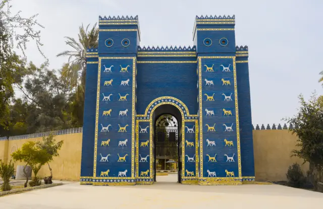 Град Вавилон се гордее със зашеметяващата порта на Ищар, украсена с ярки сини плочки, изобразяващи митични същества. Посветено на богинята Ищар, това архитектурно чудо демонстрира майсторството на вавилонците в занаятите и изразяването с художествени средства.