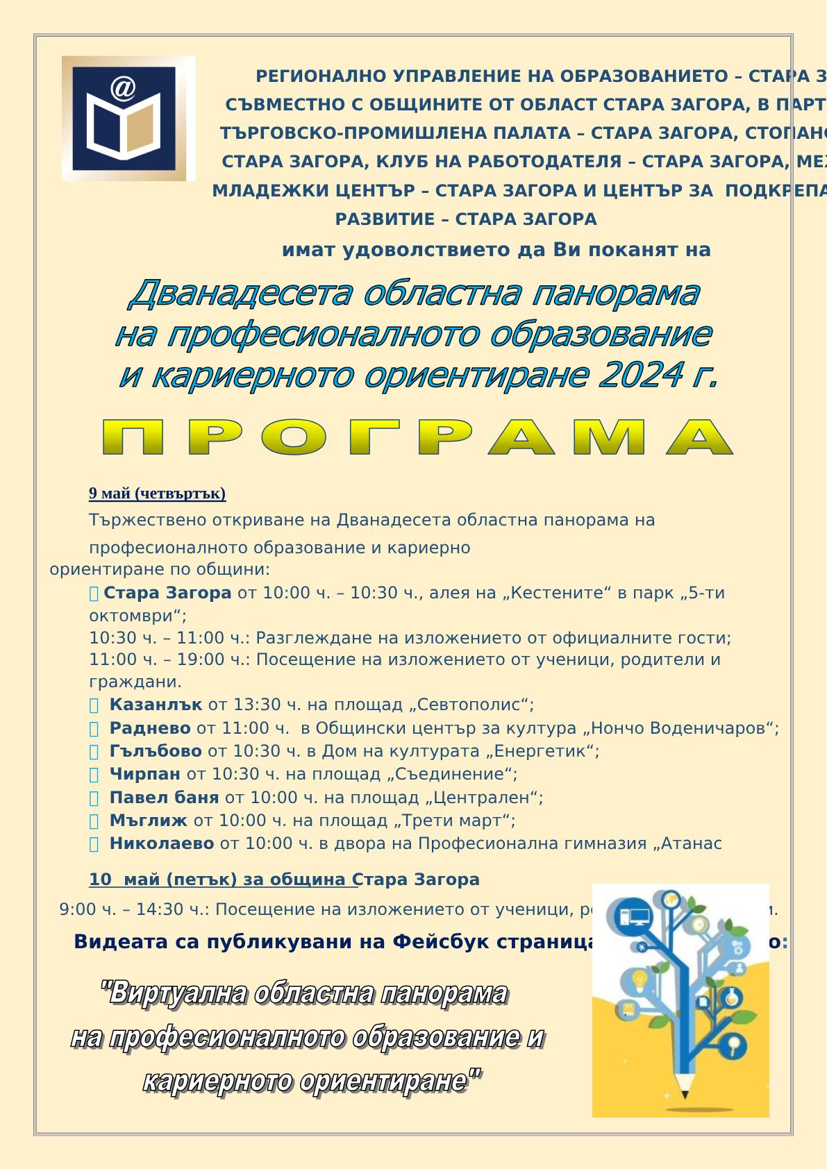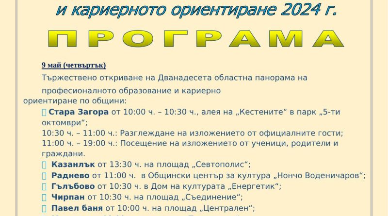 Повече подробности за събитието може да откриете на: https://www.starazagora.bg/bg/novini/za-dvanadeseti-pat-oblastna-panorama-na-profesionalnoto-obrazovanie-i-kariernoto-orientirane-v-stara-zagora.