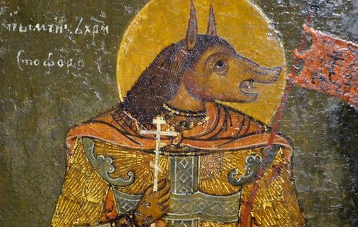 Любопитна подробност е, че на много православни икони свети Христофор е нарисуван с глава на куче и ореол около нея. Вероятно това е свързано с древния култ към египетското божество Анубис – пътеводител и защитник на душите на починалите. В Западна Европа светецът е изобразяван като гигант с тояга в ръка, обикновено преминаващ река, с детето Иисус Христос на рамо.