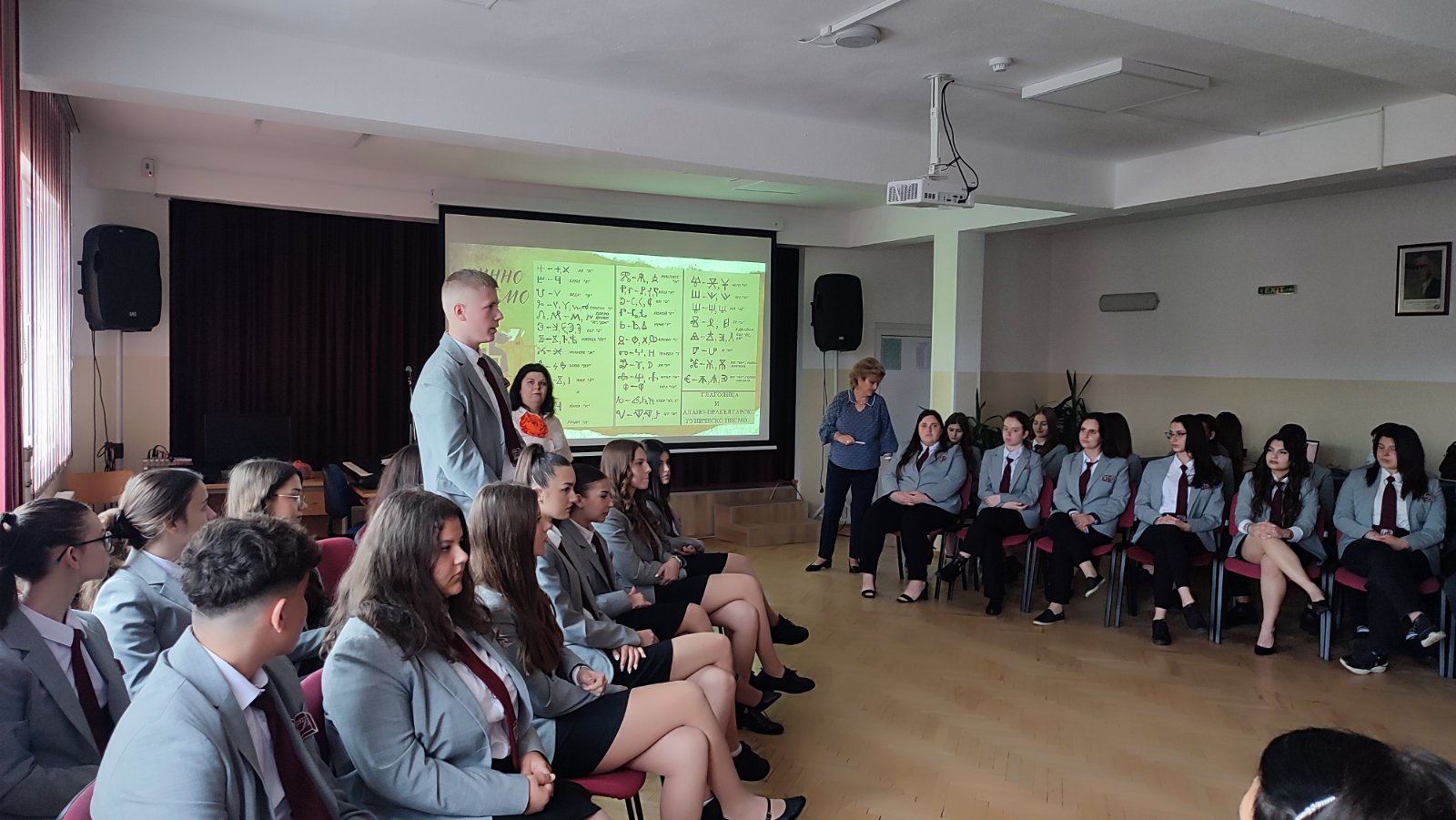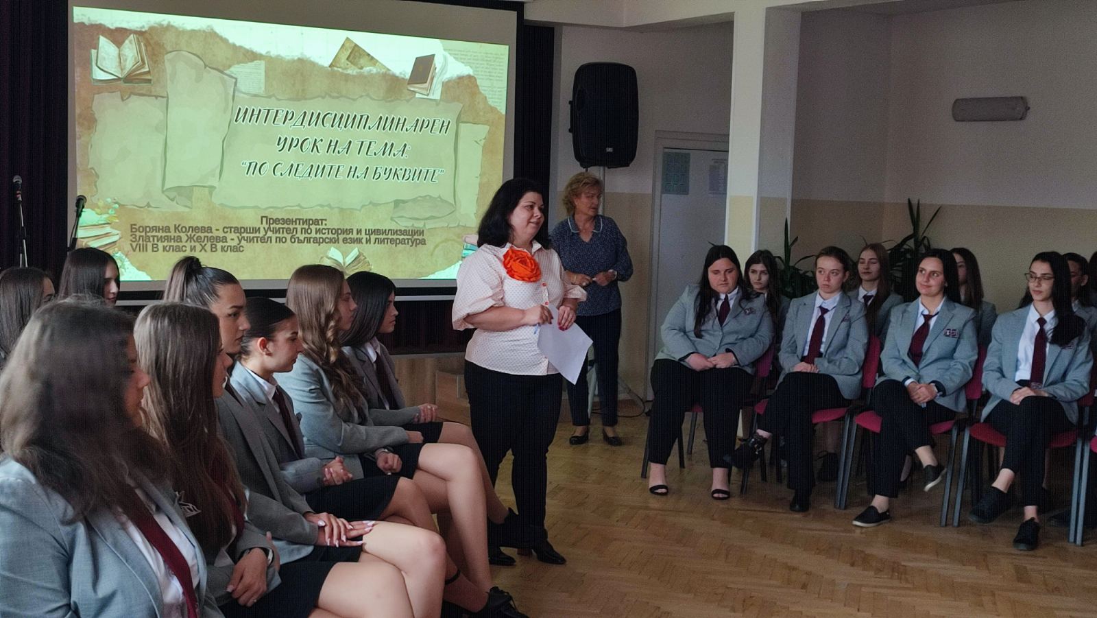 След това бе представен интердисциплинарен урок на тема „По следите на буквите“ в зала „Слави Абанозов“ от г-жа Боряна Колева – старши учител по истории и цивилизация, г-жа Златияна Желева – учител по български език и литература и ученици от 8 в и 10 в клас, специалност „Икономика и мениджмънт“. Те пренесоха гостите в далечната 1867 година в Калофер, където Христо Ботев – млад даскал, син на най-почитания просветен деец, изнася пламенно слово по повод предстоящия 11 май – Празник на светите братя Кирил и Методий. Заразиха ги с патоса и вълнението на един празник, който по своя смисъл е значим дотолкова, че слага началото на славянската култура, която векове наред обединява славяните по света. Следите на буквите отведоха по пътя на Кирил и Методий и техните религиозни и дипломатически мисии. A шепотът им провокира учениците да споделят своите знания за тяхната символика и разпространение. След края на урока част от гостите на събитието (Теодора Нончева – Заместник областен управител, Милена Йолдова – Началник на РУО Стара Загора, Иван Желязков – старши експерт по български език и литература и Иванка Сотирова – Омбудсман на Стара Загора) изразиха своите впечатления и поздравления към учителите и учениците и им пожелаха винаги да бъдат носители на словото, което носи светлина.