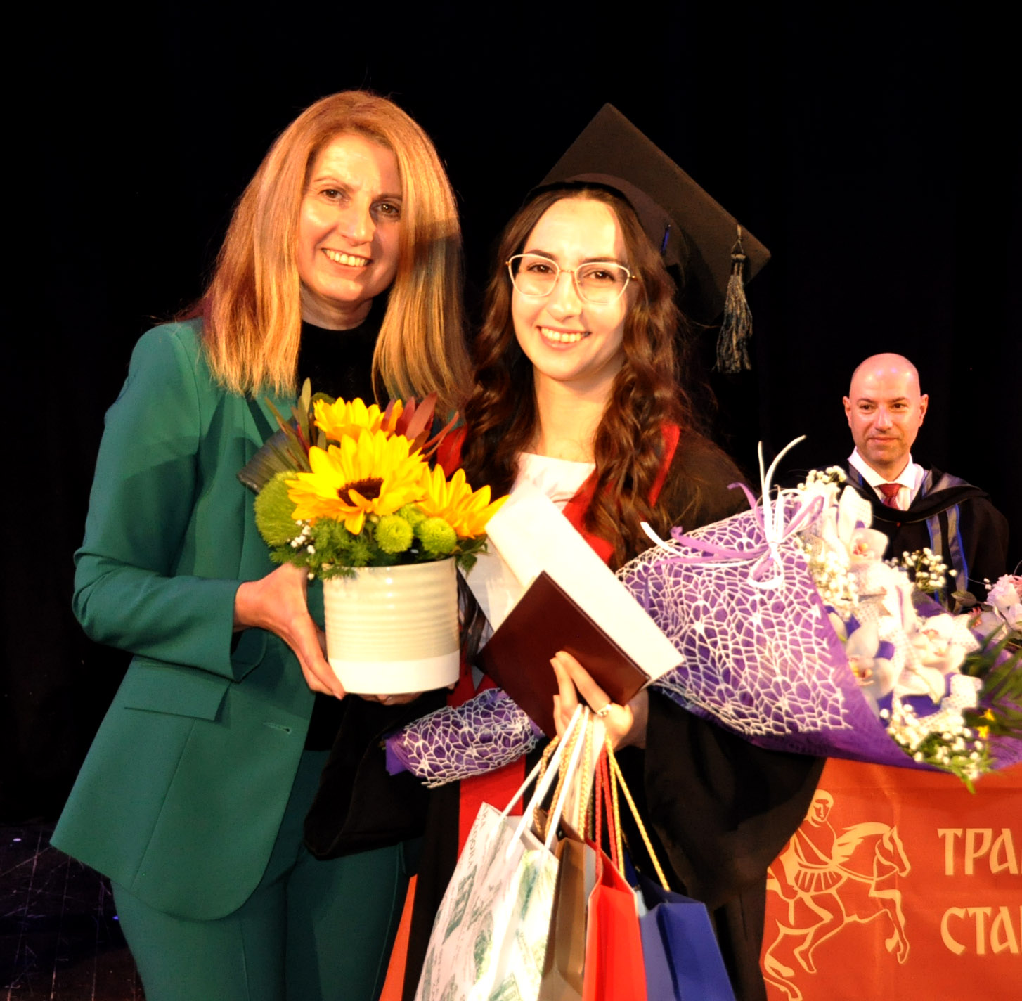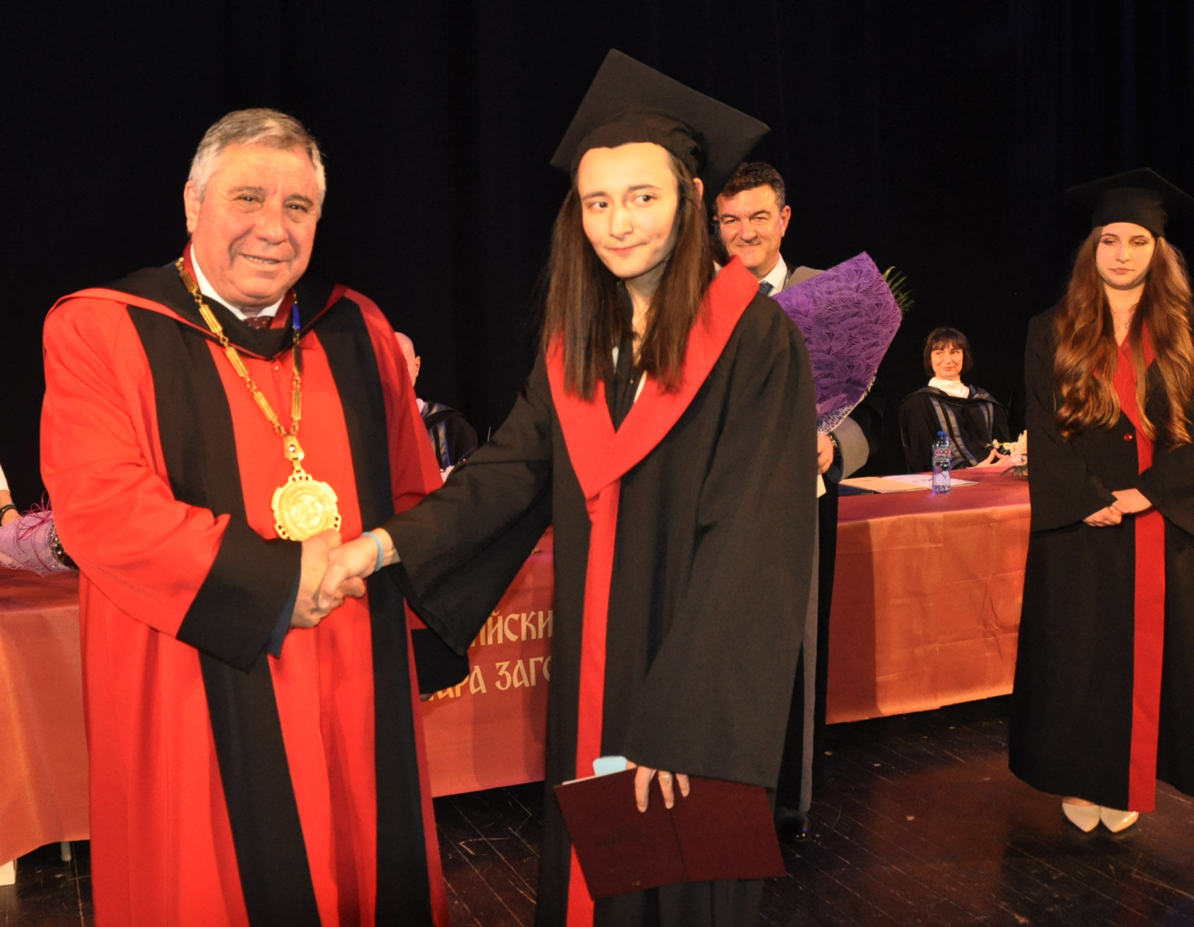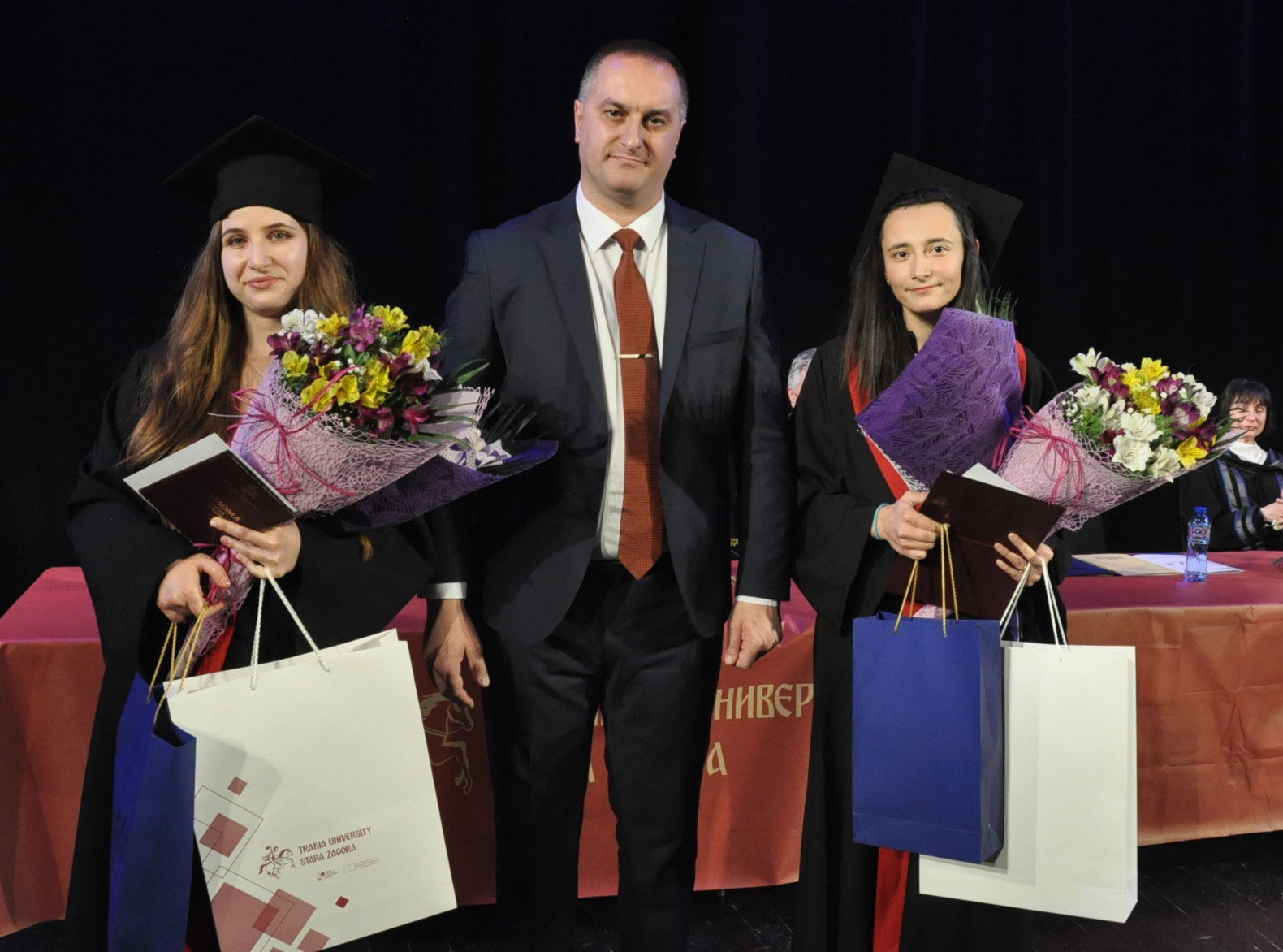 Като първенци на випуска тази година бяха отличени две дами – д-р Дарина Иванова и д-р Михаела Иванова, които се дипломират успешно с еднакъв успех – отличен 5,78 и изнесоха слово от името на абсолвентите. Лично ректорът на Тракийски университет – проф. Ярков – връчи дипломите на отличените студенти и им пожела успех. Първенците на випуска получиха подаръци и от декана на Ветеринарномедицински факултет – доц. д-р Лазарин Лазаров, както и от представители на държавни институции и бизнес партньори. Общо 6-ма ветеринарни лекари завършват с отличен успех тази година, а 18 техни колеги се дипломират с успех мн. добър.