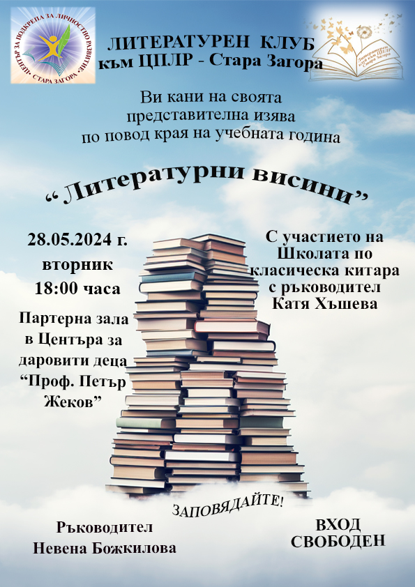 Заедно изкачихме своите „Литературни висини“ и тази учебна година. Учените и младежите от Литературен клуб към Център за подкрепа за личностното развитие ЦПЛР – Стара Загора представиха пред публика своите стихове, разкази, приказки и есета, които са сътворили през изминалата учебна година и които им донесоха множество награди и отличия.