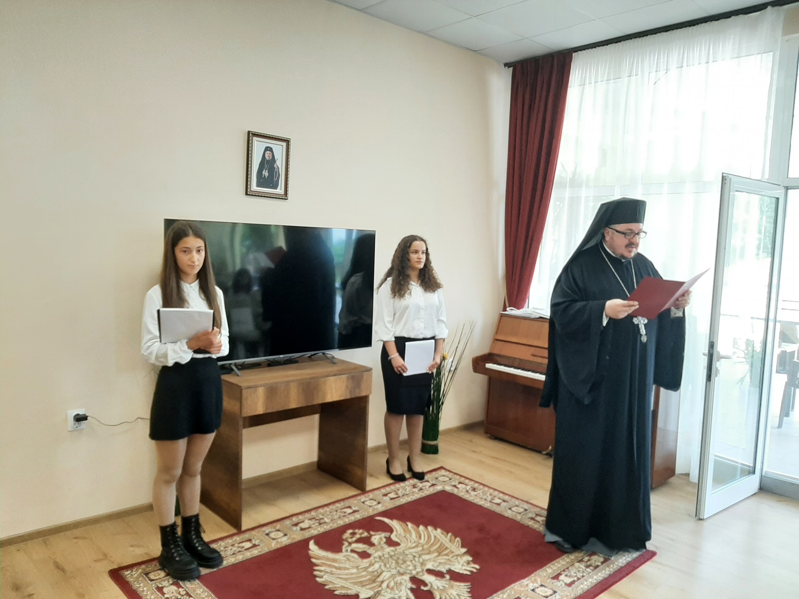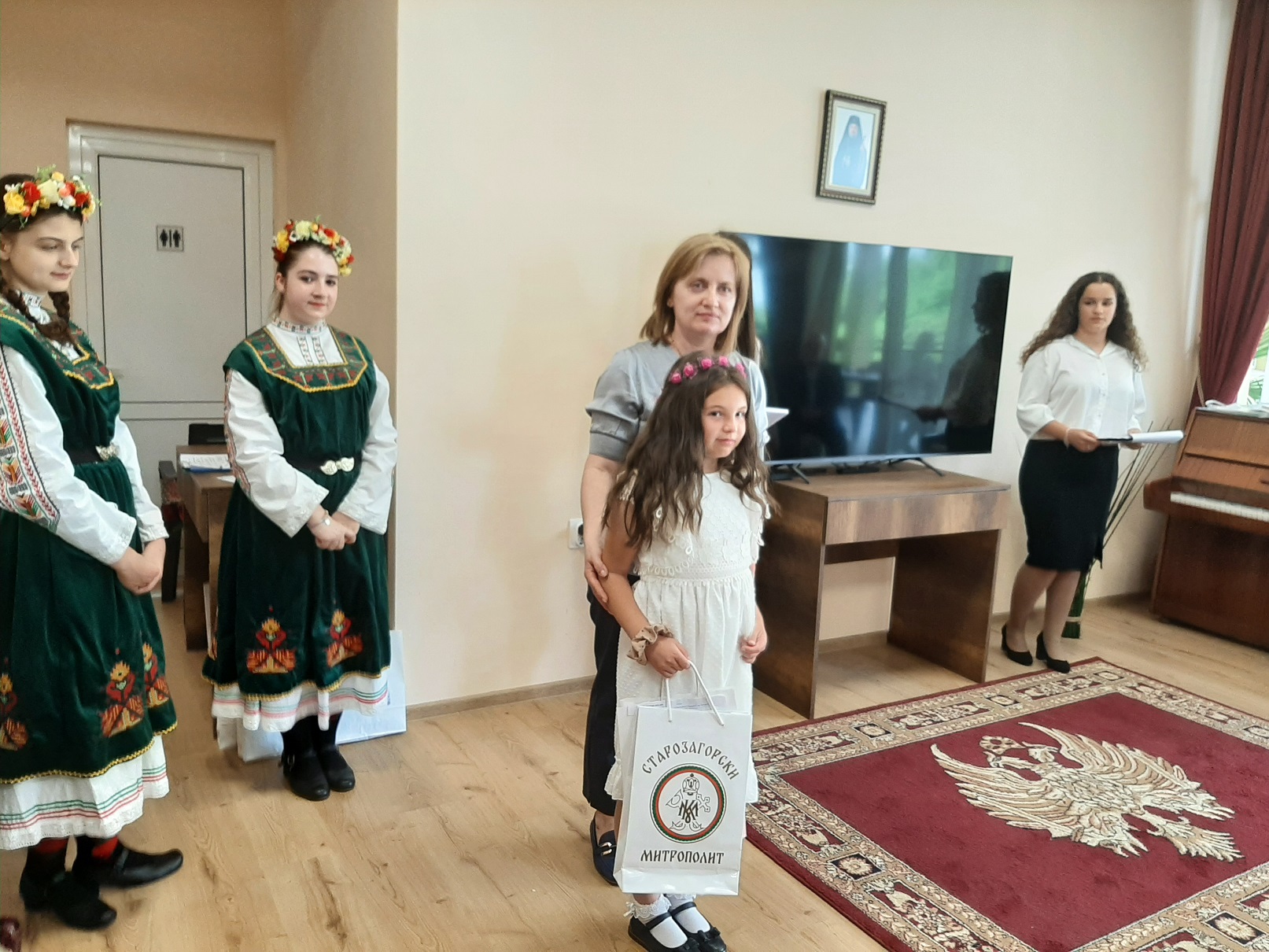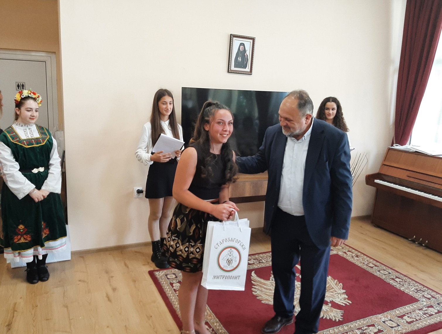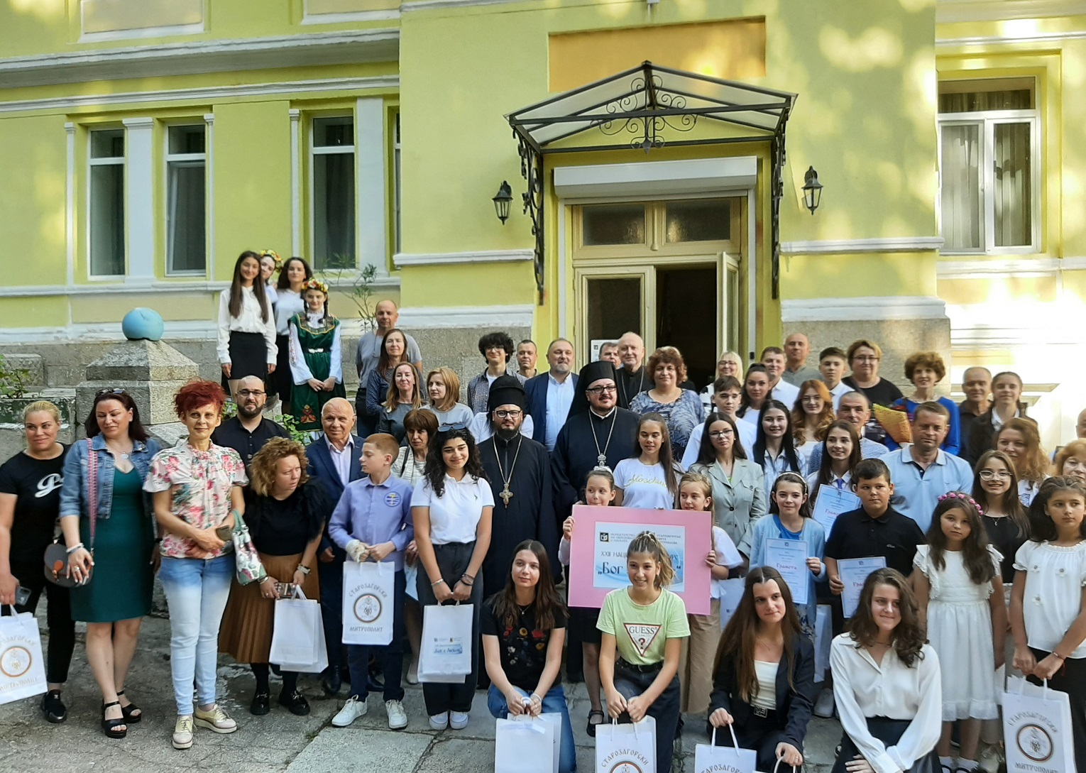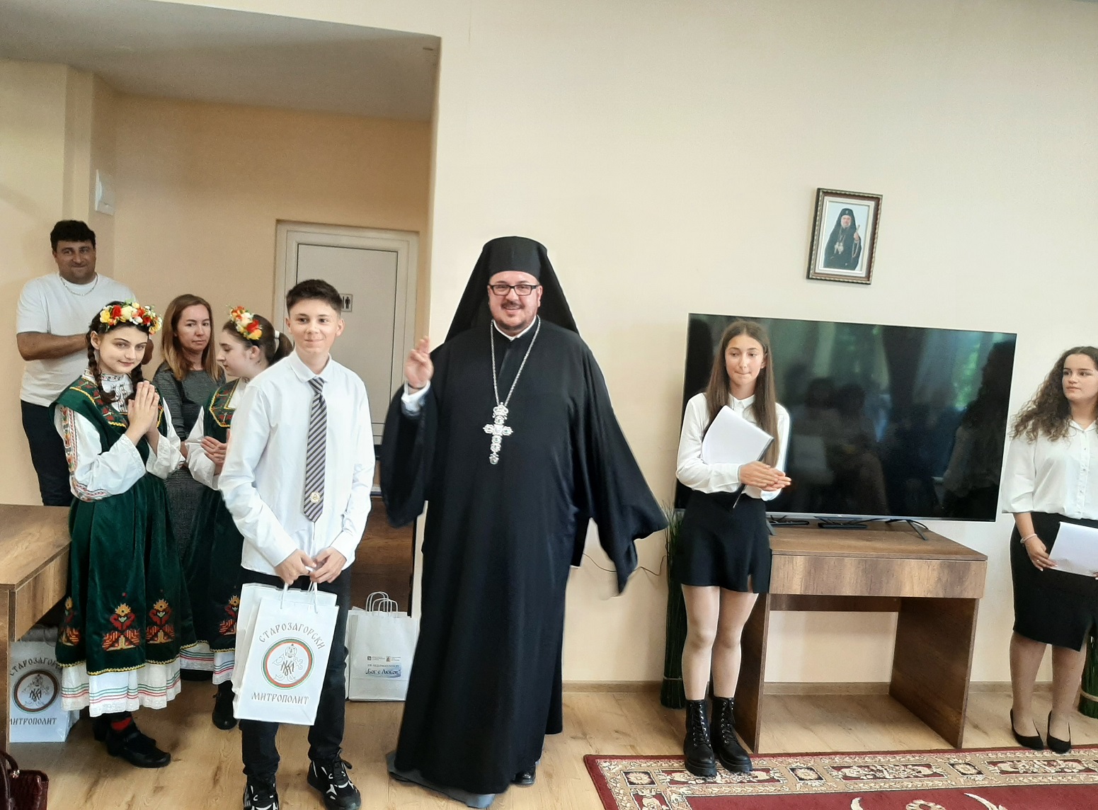 В началото на събитието Негово Високопреподобие архимандрит Богослов Димитров отправи от името на Негово Високопреосвещенство Старозагорския митрополит Киприан официално поздравление към присъстващите: „На всички вас, малки и големи, молитвено благопожелаваме да пребъдвате в присъщите на детството чистота, невинност и почит към вашите родители. За тях вие сте благословение от Господа, затова че слушайте и обичайте с цялото си сърце. Православната църква всякога се моли за всички подрастващи, майчински се грижи за вас и ви посочва верния път, свидетелствувайки за непреходните християнски ценности и морални устои, които са фундамент на доброто и градивно личностно развитие на човека. С архипастирски поздрав и благослов за преподаватели, деца и родители, молим духа на премъдростта днес и във всички дни да бъде с вас, да ви укрепява и съпровожда по пътя на любовта и истината, на всичко онова, що е добро и полезно за човешкото спасение. Честит празник, мили деца! Божията благодатна помощ да бъде винаги с вас!“.