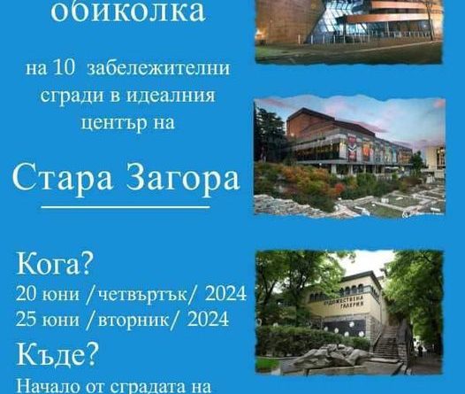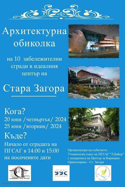 Ученическият съвет при Професионална гимназия по строителство, архитектура и геодезия (ПГСАГ) “Лубор Байер“ Стара Загора с подкрепата на Центъра за кариерно ориентиране организира Архитектурна обиколка на десет забележителни сгради в идеалния център на Стара Загора. Събитието ще се състои на 20 -ти и 25 юни 2024г. от 14:00 и 15:00 ч.