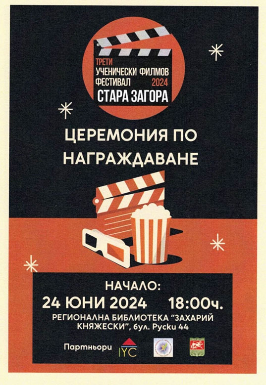 Днес, 24 юни 2024 г. в залата на РБ”Захарий Княжески” ще се състои връчване на отличия на наградените участници в III Национален ученически кинофест 2024, организиран от Център за подкрепа за личностното развитие – Стара Загора и Междунаровден младежки център-Стара Загора.