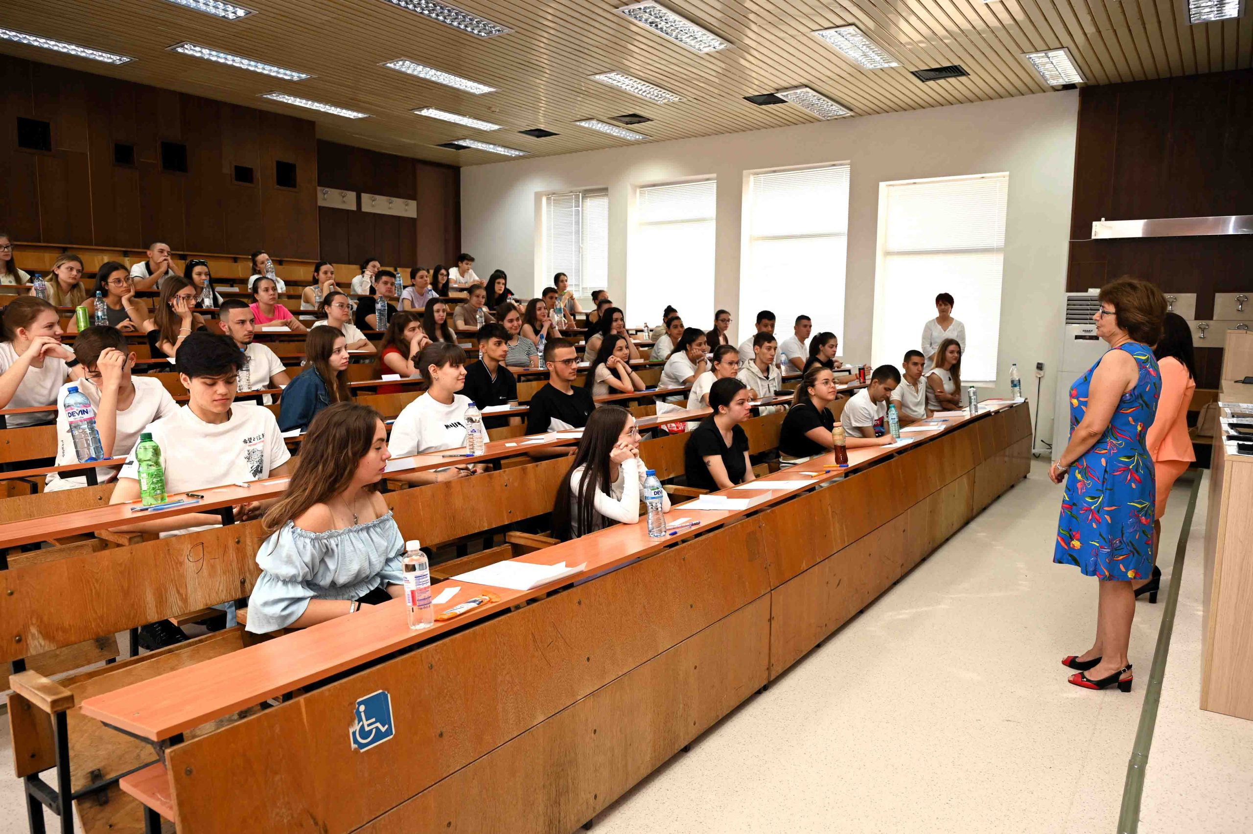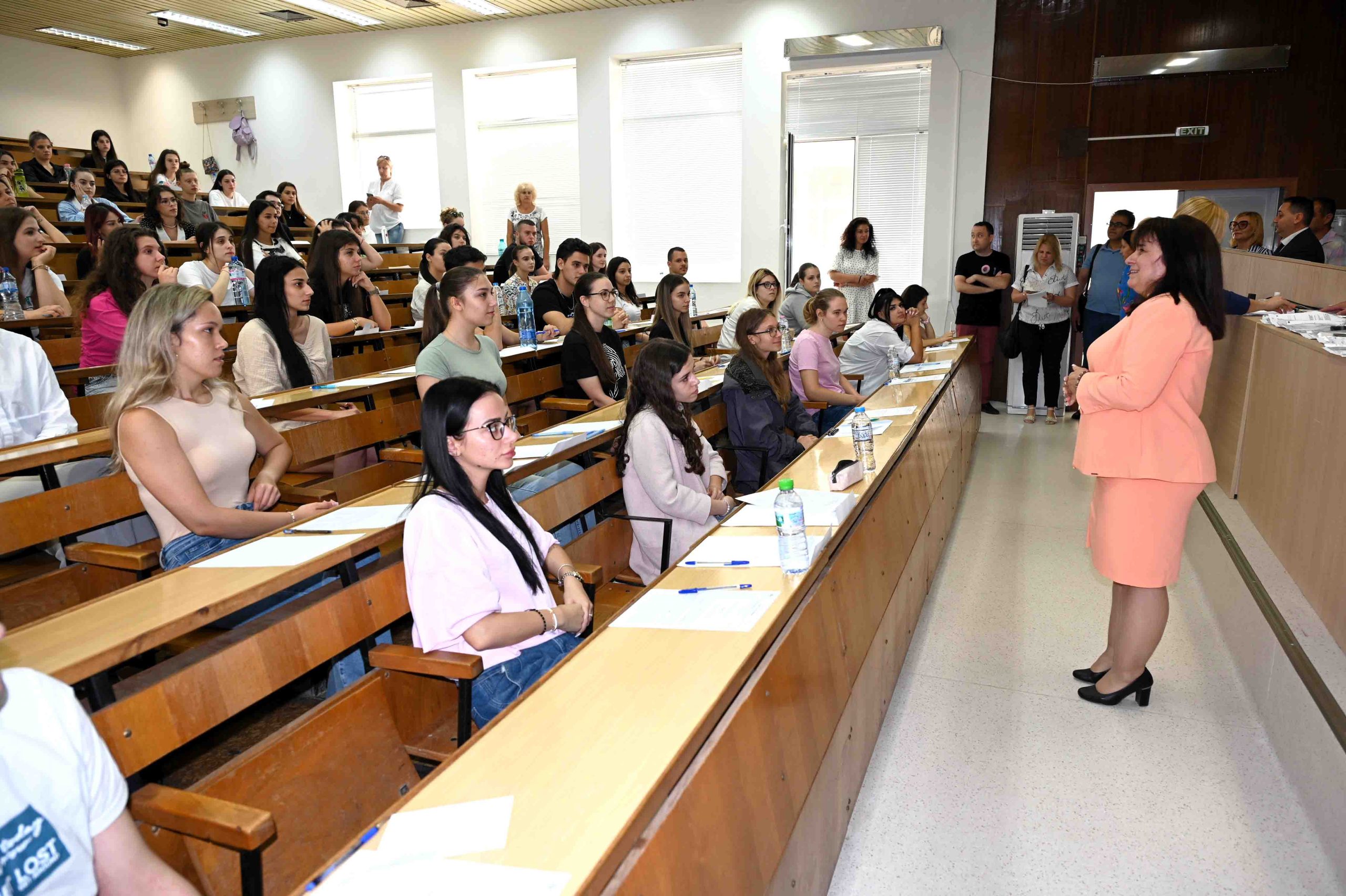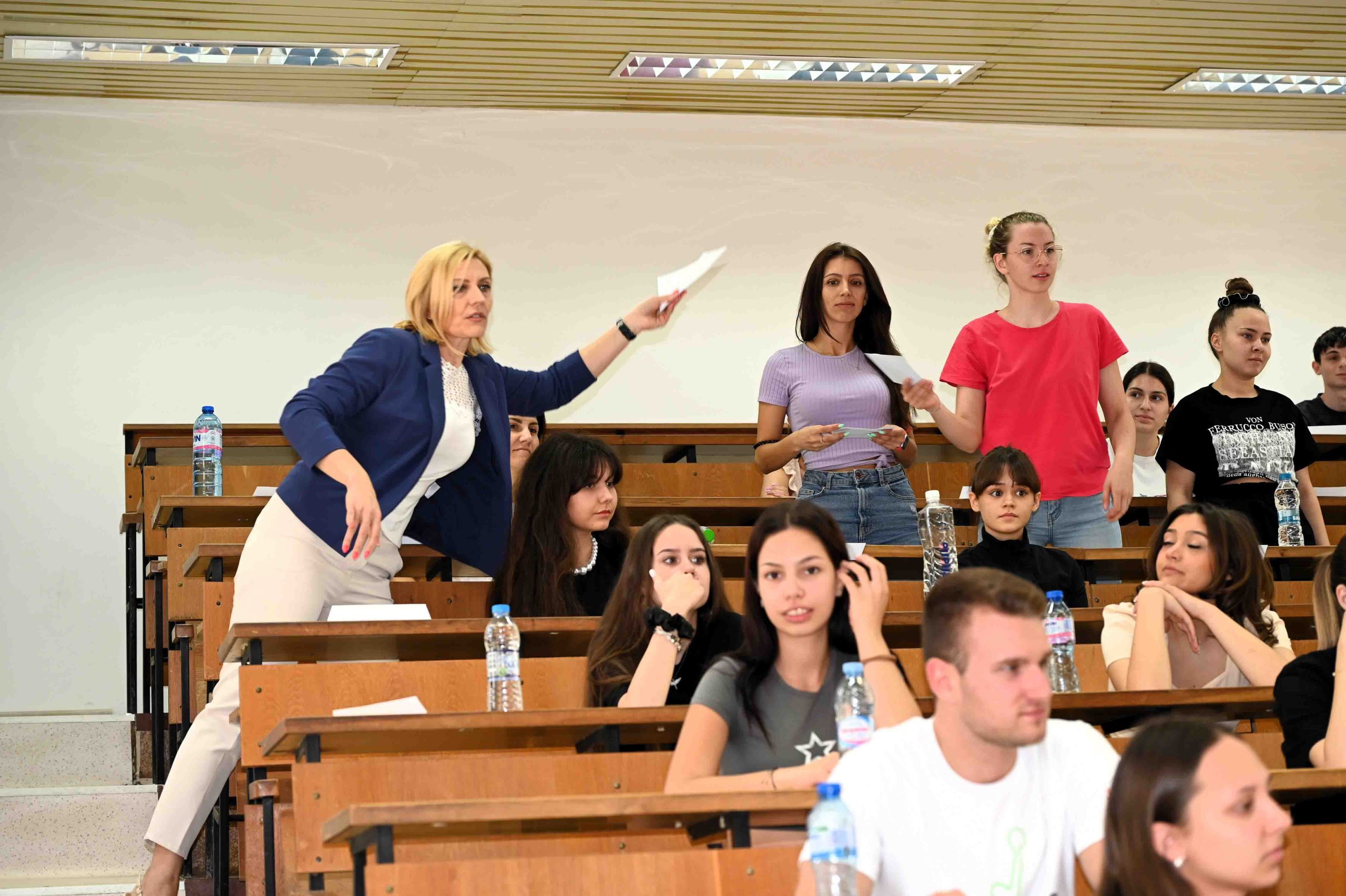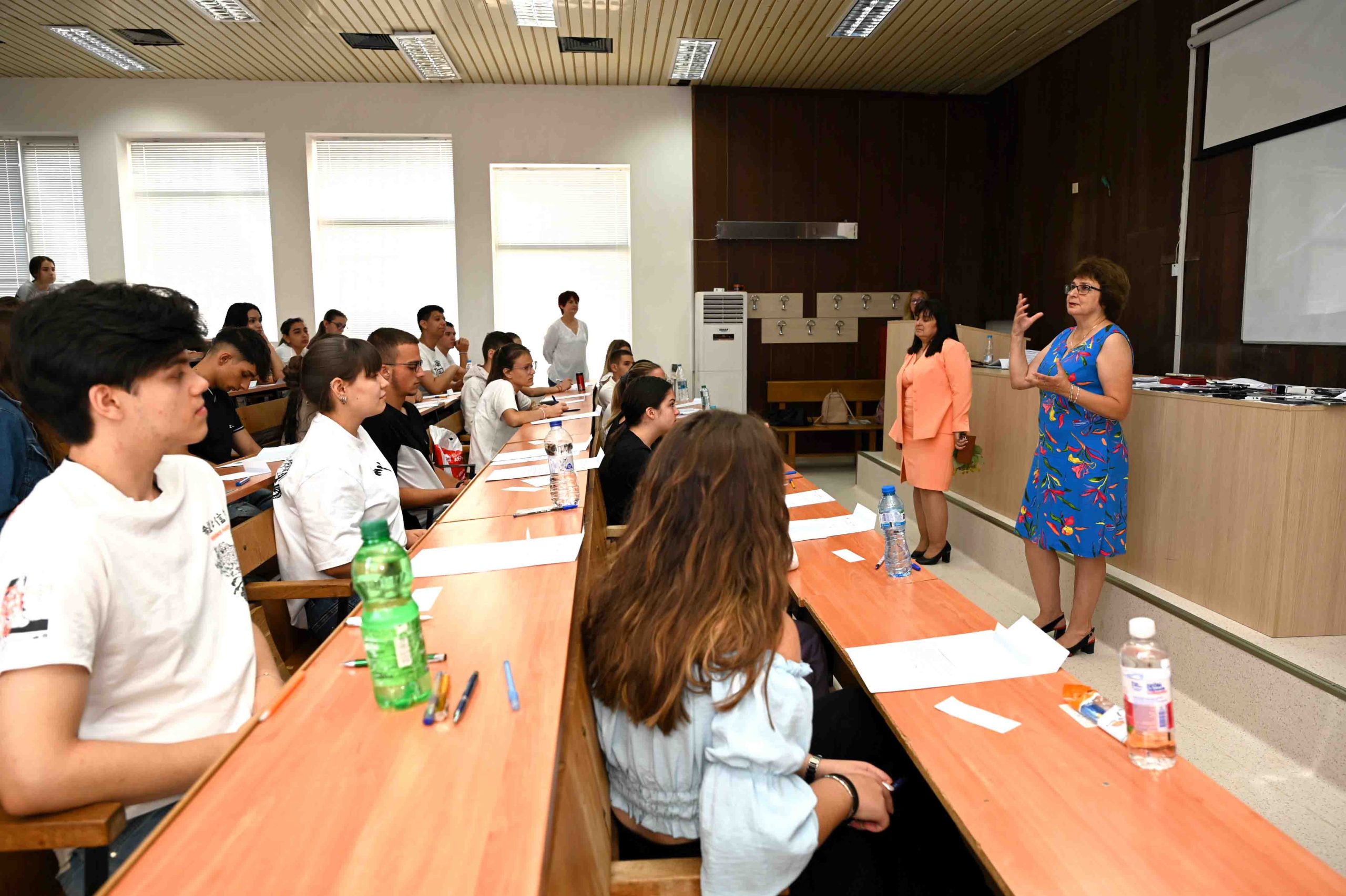 Членове на комисията по проверка на кандидатстудентските писмени работи преминаха за инструктаж през всички 10 учебни зали, в които се провежда изпитът. Лично председателят на комисията – проф. Влайкова даде необходимите разяснения на кандидатите.