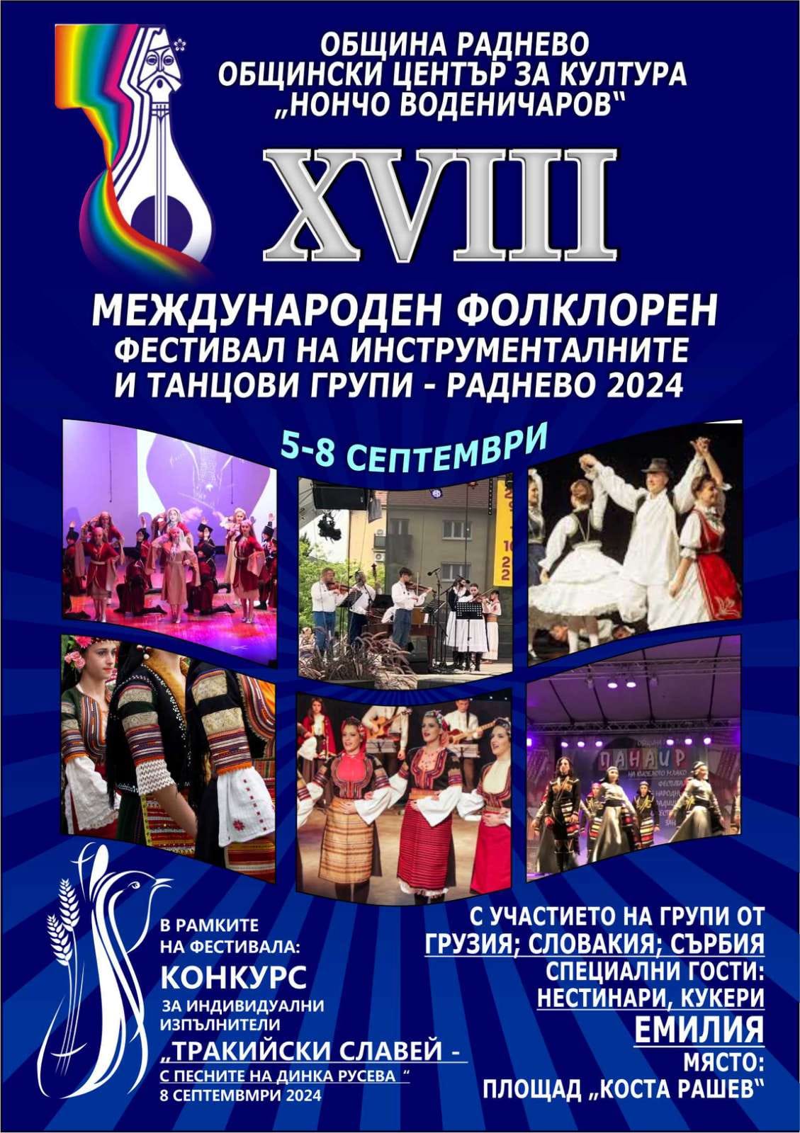 От 5-ти до 8-ми септември 2024 г., на площад „Коста Рашев“ в Раднево ще се проведе Международен фолклорен фестивал. В рамките на форума ще се проведе конкурсът за индивидуални изпълнители „Тракийски славеи“ – с песните на Динка Русева.
