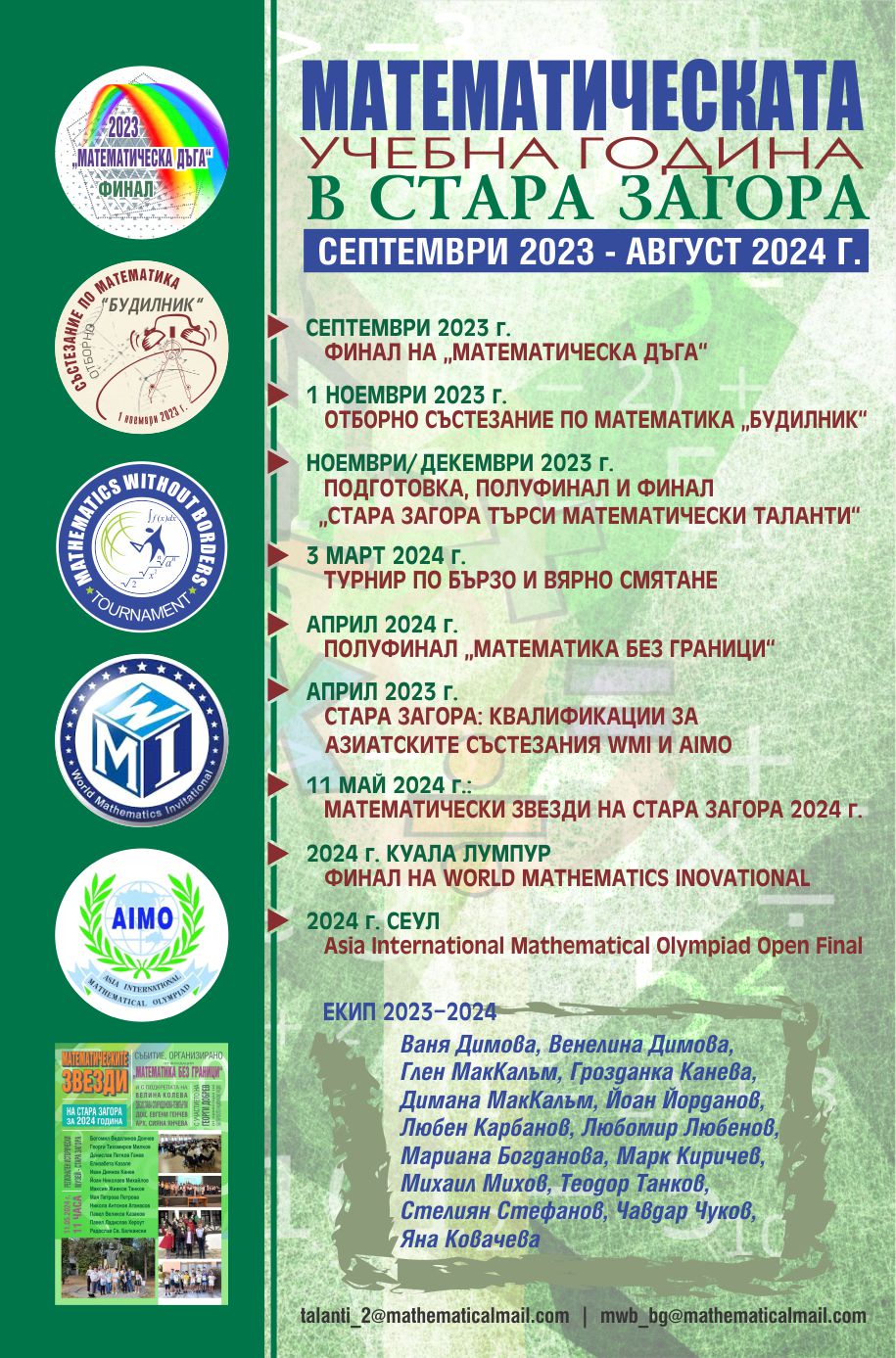 На 21 септември 2024 г. в Стара Загора 50 млади математици от 1 до 6 клас от цялата страна, преминали обучение върху 15 теми в две сесии на клуб „Математически таланти“, ще участват в преглед на знанията в състезание от 5 задачи и един аритметичен ребус.