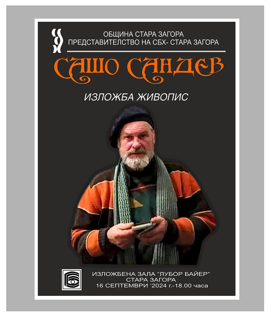Живописни картини на Сашо Сандев ще бъдат изложени в зала „Лубор Байер“ от 18.00 часа днес, 16 септември 2024г. Старозагорци и гостите на града ще имат възможност да се насладят на експозицията до 28 септември 2024 г.