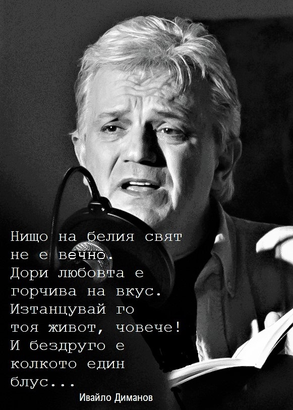 Правя уговорка още в началото: нека да не съпоставяме стиховете на Ивайло Диманов с тези на Окуджава. Въпреки че и двамата са бардове, срещали са се, Диманов е свирил на китарата на Булат Шалвович, която никой друг не е докосвал, после е взел интервю от основателя на жанра авторска песен. Но и двамата с творчеството си доказват, че прекрасното и грозното – като нагласи и очаквания за бъдещето, зависят само от настоящето и от съдържанието на авторовата душа и силата на авторовия талант.