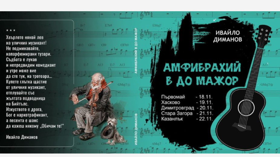 Ивайло Диманов дойде в Стара Загора и представи най-новата си книга „Амфибрахий в До мажор“, в която са събрани 60 негови стихотворения в три раздела: „Драсна Бог с кибрит“, „Това не е сонет…“ и „Вървиш отчаян…“ (всъщност са стихове).