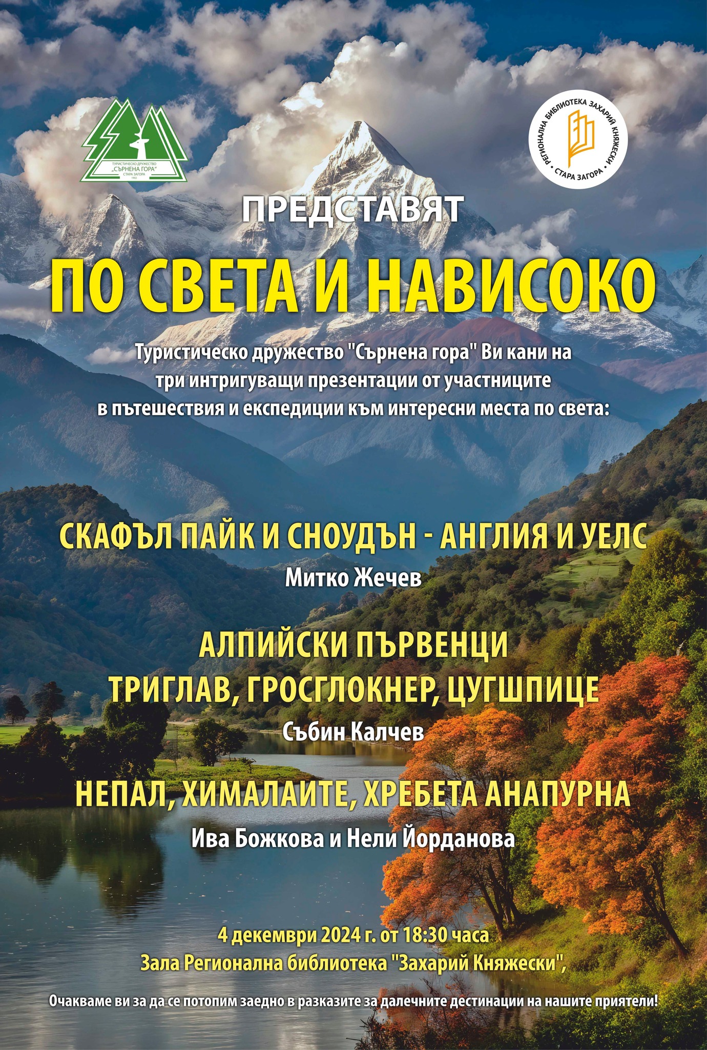 На 4 декември 2024 г., сряда, в 18,30 ч. ще ви очакваме в залата на Регионална библиотека „Захарий Княжески“, където ще ви срещнем с три интересни и далечни дестинации – на живо, от първо лице, пътешествениците, посетили земите и върховете на два различни континента, ще ви разкажат и покажат преживяванията си по света и нависоко.