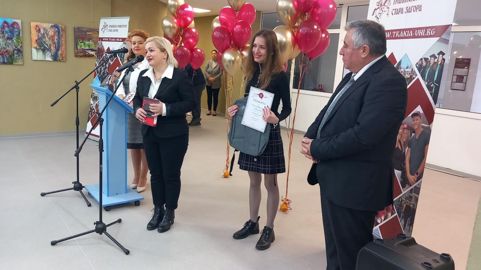 При връчването на наградите зам.-кметът на Община Стара Загора Павлина Делчева получи благодарност за осезаемата подкрепа от страна на местната власт и сътрудничеството със студентите от Жасмин Георгиев, специалност „Софтуерно инженерство“ в Стопански факултет.