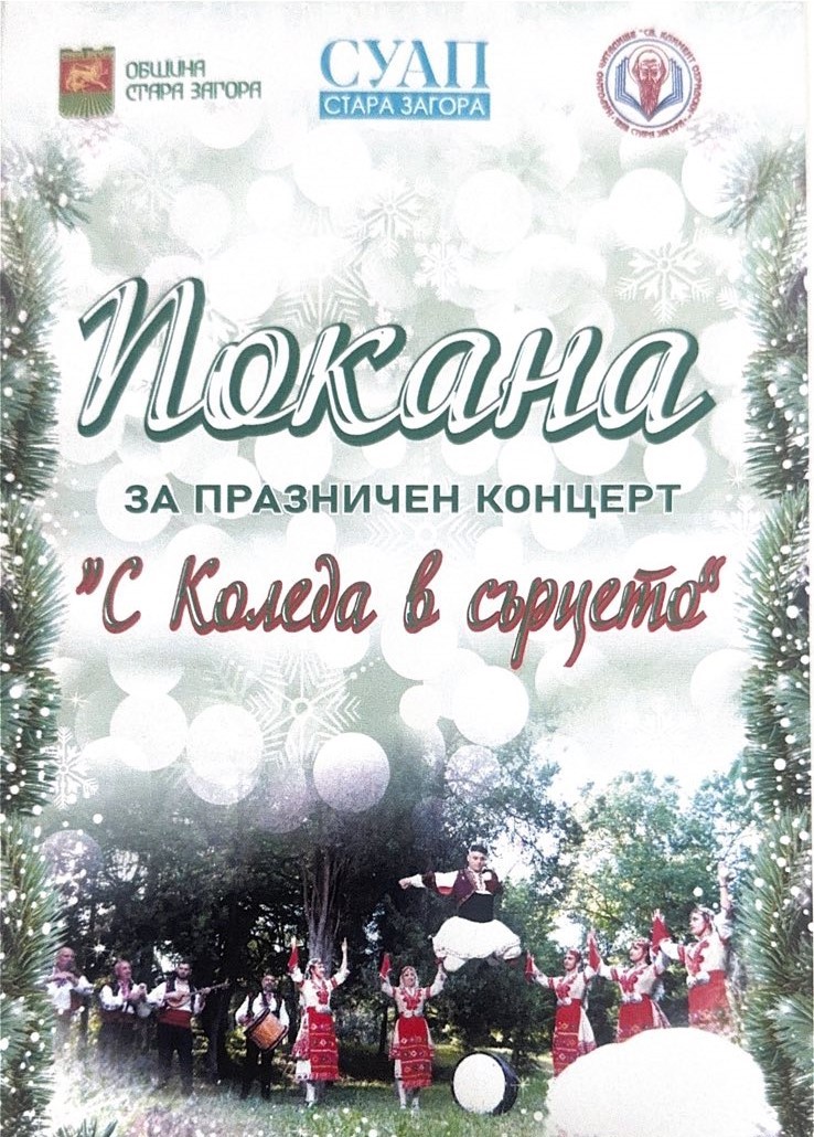 Празничен концерт, озаглавен одухотворено „С Коледа в сърцето“, е подготвен за радост на хората с увреждания в община Стара Загора. Концертът ще се състои на 13 декември 2024 г., петък, от 14.00 до 16.00 часа в Спортна зала „Иван Вазов“ в град Стара Загора. Половин час по-рано, още в 13.30 часа, Общинският духов оркестър ще свири пред залата като покана към старозагорци.