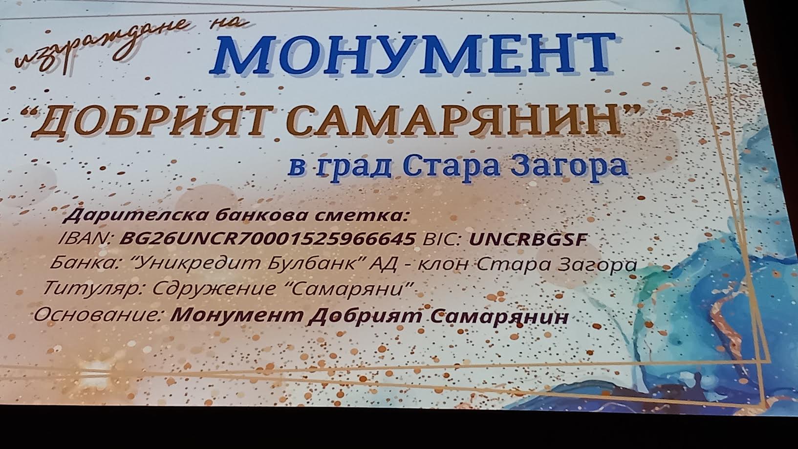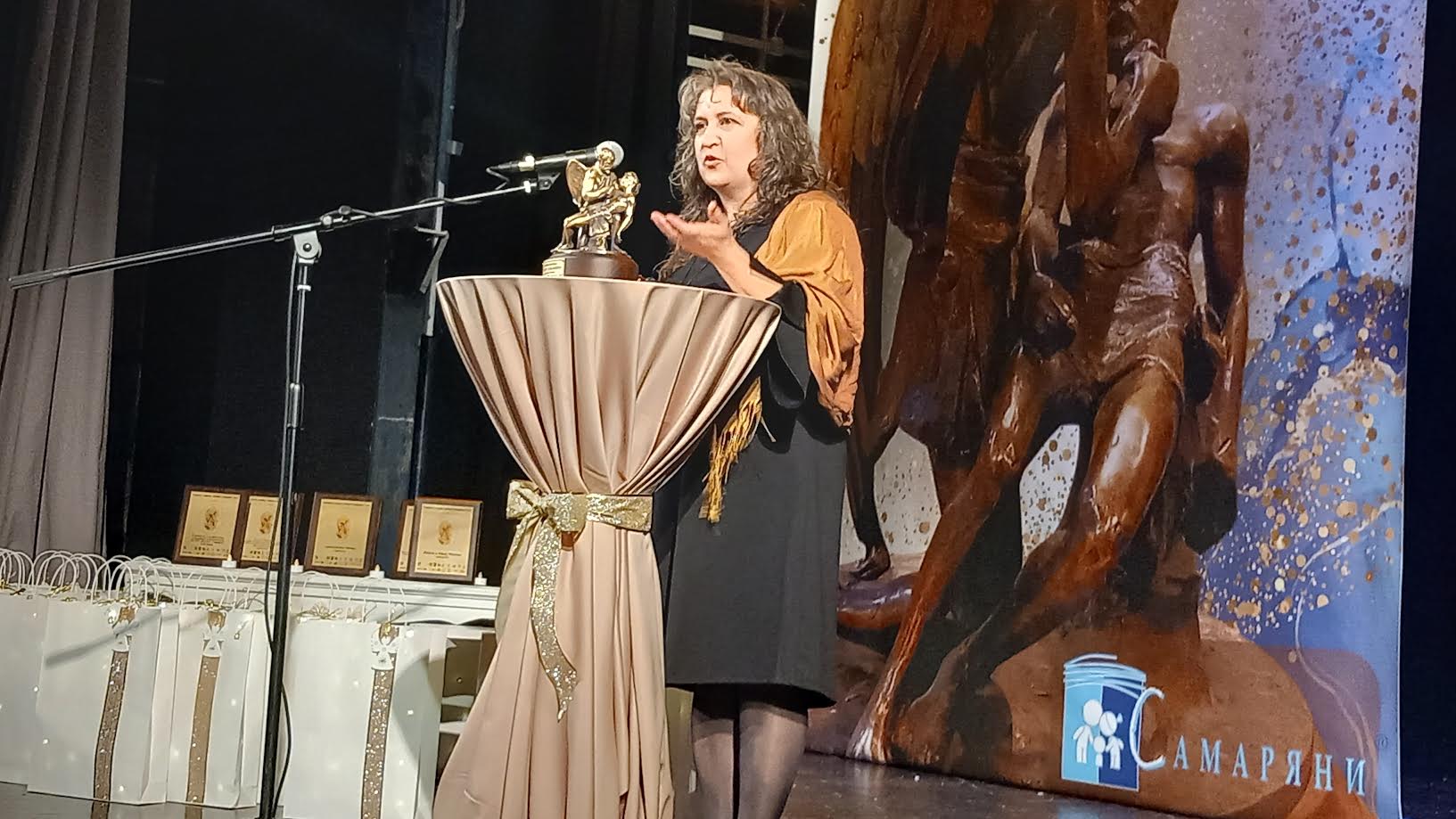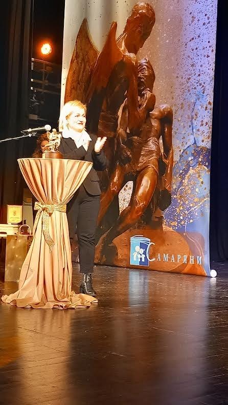 Като стоплящо сърцето тържество на добротата и любовта определи церемонията снощи Иванка Попова, един от учредителите на Сдружение „Самаряни“ и председател на Управителния съвет. Тя цитира пространно словата за доброто на Иисус Христос, записани в евангелията на Лука и Матей. „Искам да споделя нашата мечта на Сдружение „Самаряни“, която сме обсъдили с художника Иван Костов при създаването на статуетката на голямата награда, изобразяваща притчата за добрия самарянин. Добротворецът, който се уподобява на ангелите и му израстват крила! Виждате още нещо характерно – една разкъсана кесия на ограбения и пребит по път“, посочи Иванка Попова. Тя обяви стремежа на „Самаряни“ новата мечта да стане реалност – статуетката да се превърне в монумент в Стара Загора, който да бъде интерактивен. „В разкъсаната кесия сме предвидили да има един отвор, в който всеки дарител да може да пусне монета. След това ще последва звън от звънчета, поставен във вътрешността на монумента. Това е уникално, такъв паметник не съществува другаде“, разкри Иванка Попова.