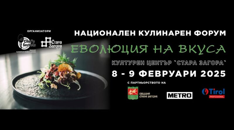 За трети път официално в Стара Загора ще се проведе Национален кулинарен форум „Еволюция на вкуса 2025 г.“ на 8 и 9 февруари 2025 г. в Културен център „Стара Загора“. Съорганизатор е Община Стара Загора и търговска верига METRO като основен партньор. На пресконференцията представителите на отдел „Туризъм“ към Община Стара Загора Ива Духтева и Илина Илиева, председателят на Българска асоциация за кулинарна култура Петър Йоргов и готвачът и председател на Шефс клуб България Тони Иванов, разясниха организацията и програмата на кулинарния форум.