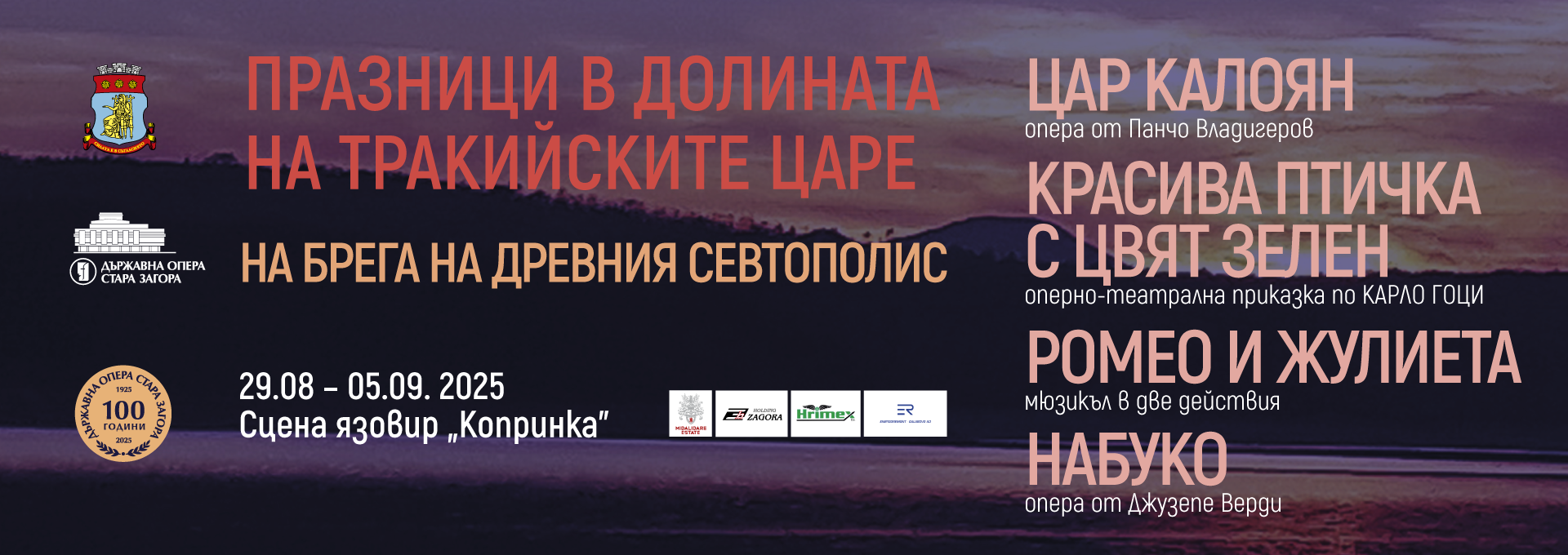 За пети пореден път кулминацията в традиционните Празници в долината на тракийските царе ще бележи Старозагорската опера, която ще представи на откритата сцена на язовир „Копринка” от 20.00 часа своите впечатляващи продукции на операта „Цар Калоян” от Панчо Владигеров /29 август/, театрално-оперната приказка „Красива птичка с цвят зелен” /съвместна продукция с Драматичен театър „Гео Милев”/ – на 31 август, мюзикъла „Ромео и Жулиета” /2 септември / и грандиозния спектакъла на операта „Набуко” – на 5 септември.