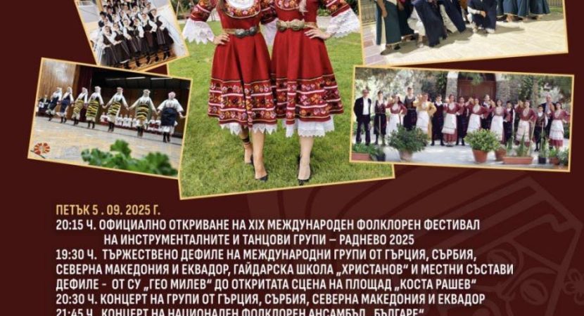 Кулинарно изложение на традиционни ястия, волейболен турнир и приятелска футболна среща са попаднали в афиша за 6 септември, когато ще се проведе и конкурсната програма на XIX Международен фолклорен фестивал – Раднево 2025. Жителите и гостите на града ще могат да видят и концертна програма на съставите от чужбина, предшестващ гост-изпълнителките на български фолклор – Калина и Невена.