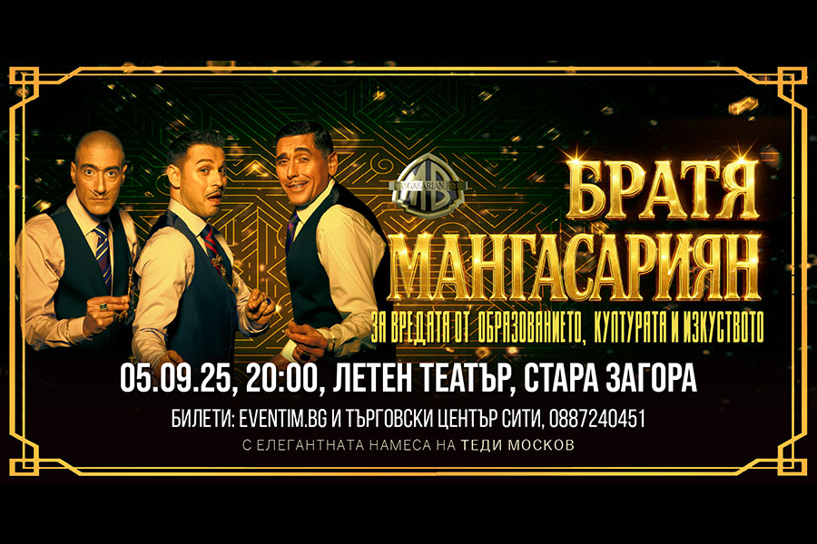 Образованието, културата и изкуството – уж трите стълба на прогреса, ще бъдат разгледани като възможна причина за бавния колапс на здравия разум. Или не съвсем? Така Братя Мангасариян анонсират лекцията си-спектакъл „За вредата от образованието, културата и изкуството“, с която ще гостуват в Стара Загора на 5 септември, от 20:00 часа, на сцената на Летния театър. Зюмбюл (Силвестър Силвестров), Кулю (Владислав Петров) и Среброто (Александър Сано) ще съчетаят театър, видео, музика на живо и стендъп комедия, за да предложат преживяване, което не просто забавлява, но и разклаща фундаментите на привидно стабилната ни реалност. „Заповядайте за да разберете защо парите, които ще дадете, ще се окажат най-добрата ви инвестиция. Ще ви спестим огромни суми, които иначе НИКОГА повече няма да дадете за театър, опера, а може би и за балет. Ще ви разкажем защо преди да тръгнеш на училище, всичко си знаеш, а само след няколко години учене, вече си напълно объркан и май има нещо гнило в образованието. Очакваме ви, за да ви облъчим с любов и да ви дарим с нешлифовани философски диаманти“, споделя триото, което изпраща изключително успешен сезон с гастролиращия си спектакъл в цялата страна.