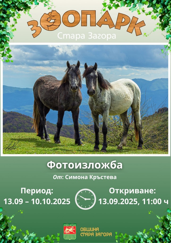 Зоопарк Стара Загора, кани на официалното откриване на 13 септември 2025 г., от 11.00 ч., на първата самостоятелна изложба на младата фотографката Симона Кръстева.