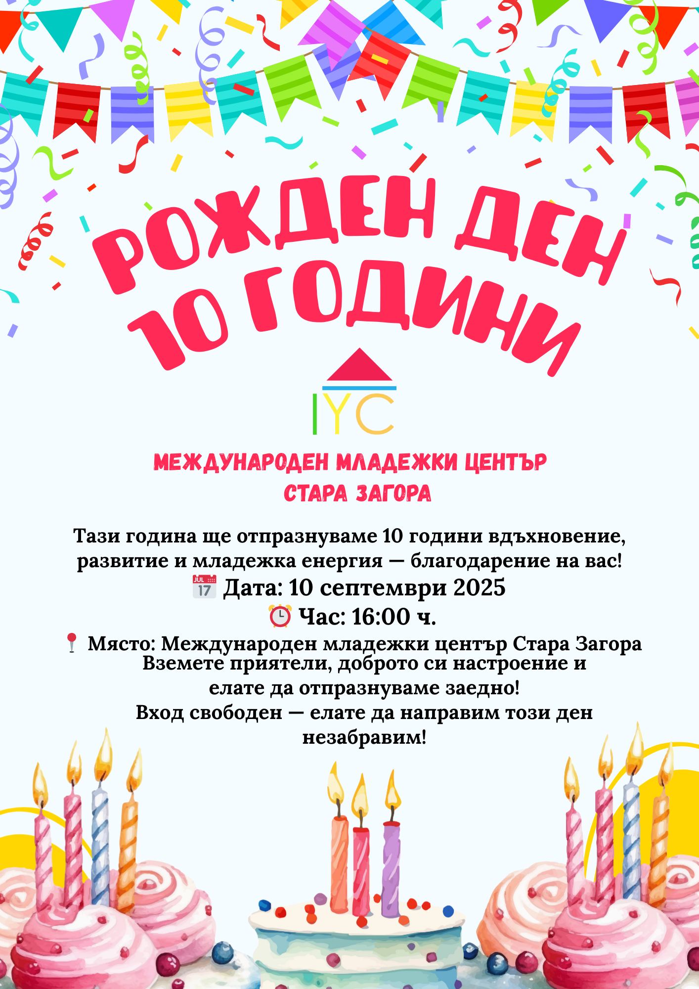 Международният младежки център – Стара Загора (ММЦ) отбелязва 10-годишни от създаването на своето младежко пространство. Десетилетие, посветено на работа с младите хора, подкрепа за техните идеи и изграждане на пространство, в което се развиват таланти и се създава силна общност. Празничното събитие ще се състои на 10 септември 2025 г. от 13.30 часа в сградата на старозагорския младежки център.