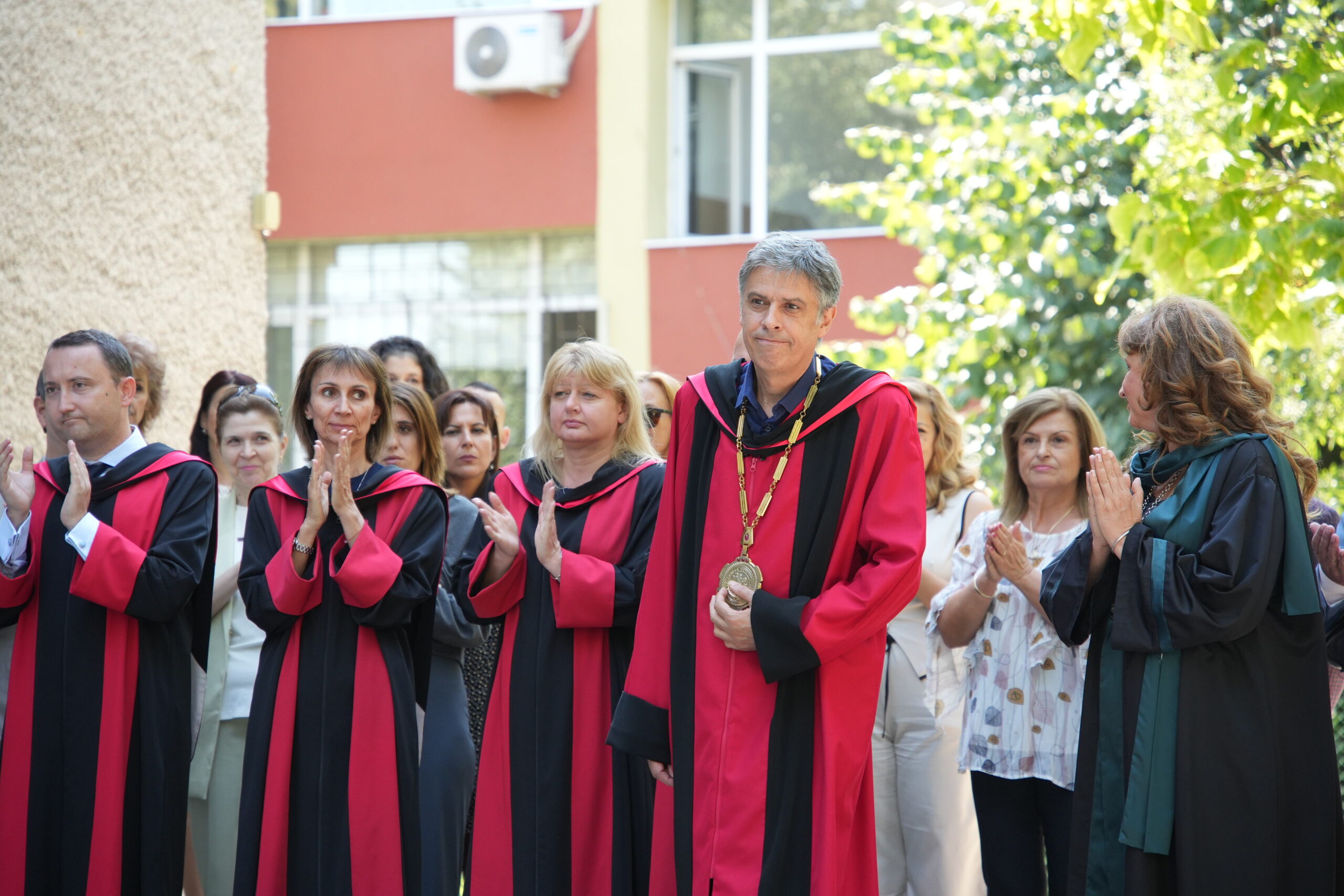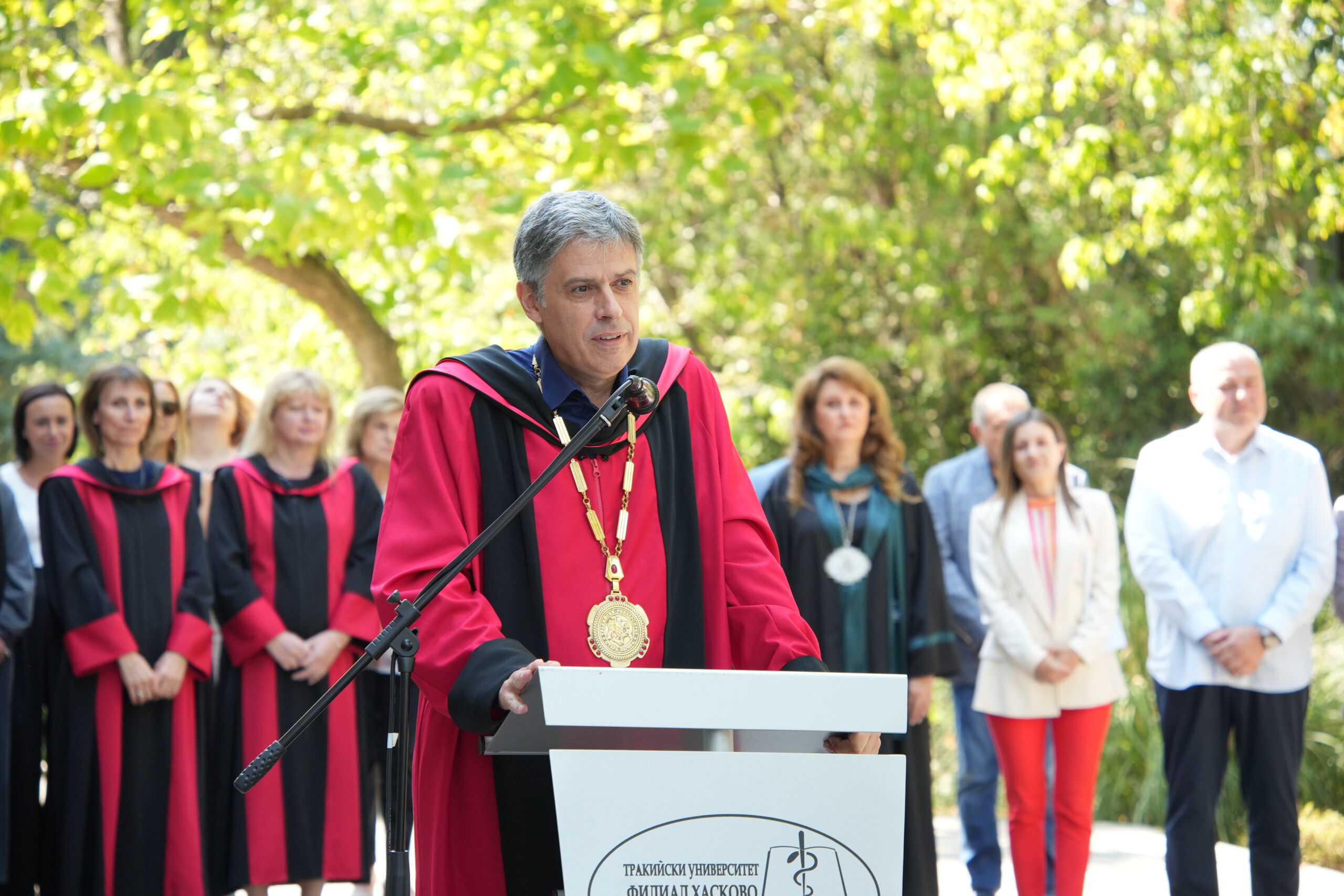 „Чувствам се изключително щастлив и развълнуван да Ви поздравя за първия учебен ден. Желая Ви да бъдете здрави и търпеливи в учението, защото търпението ще Ви донесе удовлетворение и не оставяйте ученето за последния момент, а бъдете постоянни. Уверявам Ви, че имате едни от най-добрите преподаватели и сте избрали един от най-добрите университети в България. На добър час!“, каза в приветствието си ректорът проф. Карабалиев.