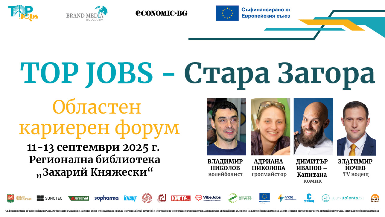 Областният кариерен форум TOP JOBS стартира утре, 11 септември 2025 г., от 11.00 часа в Регионалната библиотека „Захарий Княжески“ в Стара Загора. Три дни богата програма с популярни лица от българския спорт, театър и телевизия обещават организаторите от „Бранд Медия България“. Форумът на уменията ще се проведе с подкрепата на Европейския съюз и със стратегическото партньорство на Община Стара Загора, АРИР – Стара Загора и Тракийския университет. Медиен партньор е Kmeta.bg.