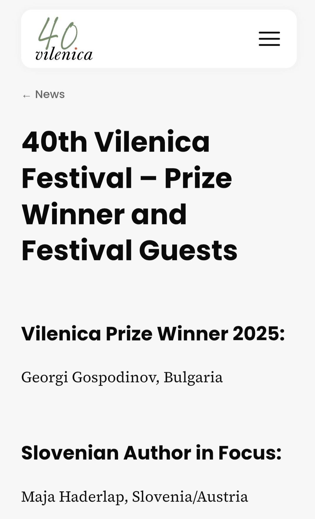 „Георги Господинов, четиридесетият лауреат на фестивала „Виленица“, въплъщава наследството му по свой неповторим начин и дава пример за това как литературата днес още може да въздейства и достига до всеки“, заяви председателят на журито, словенският поет и преводач Грегор Подлогар.